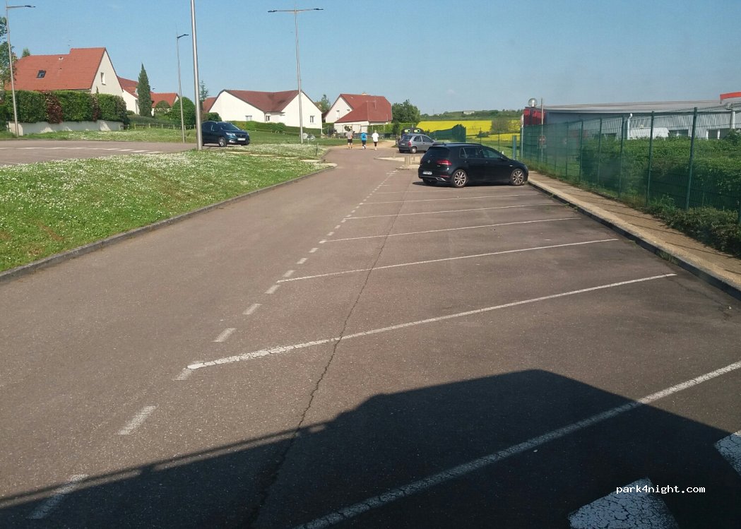 Bien pour une nuit au calme. Néanmoins en fonction de la journée il peut y avoir bcp de monde sur le parking comme c’est un centre sportif. Camping-car de max 6m je pense pour éviter de gêner sur les places.