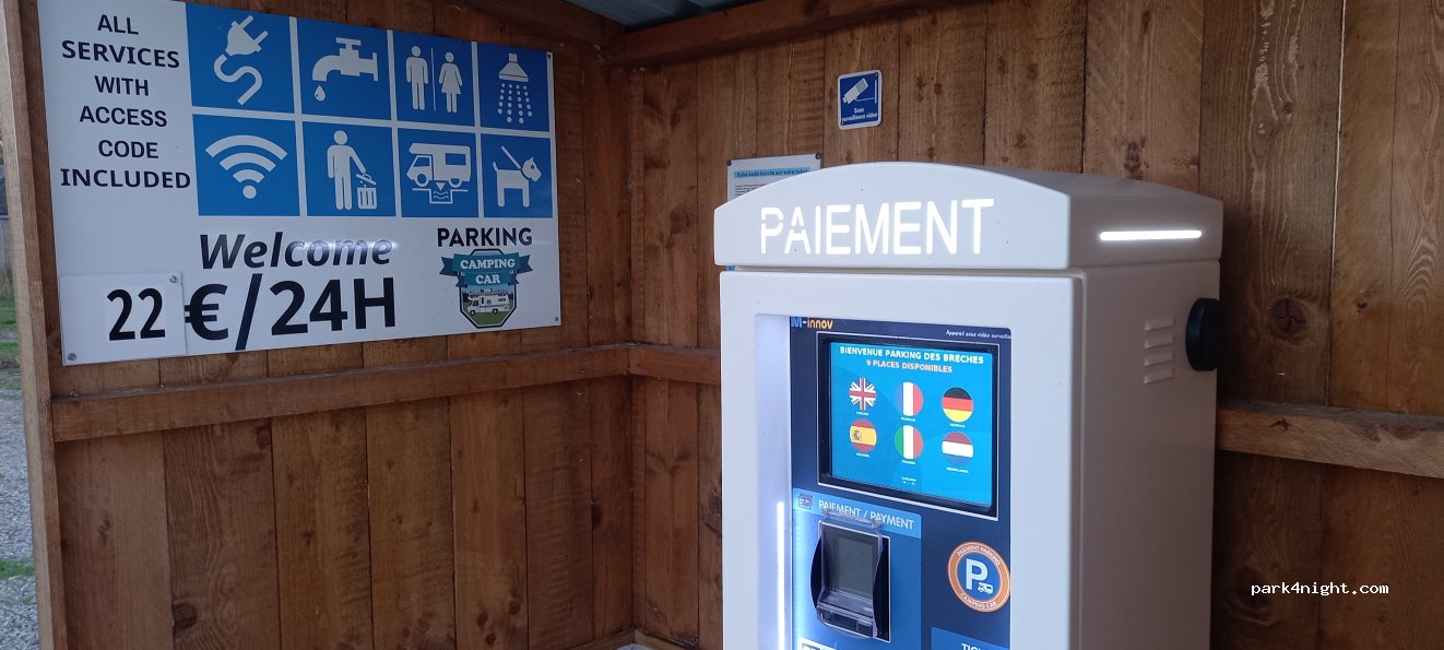 Sitio fácil de encontrar, que puedes entrar a cualquier hora haciendo el pago con tarjeta en la máquina , con buenos servicios ( electricidad, agua y vaciado de aguas), rodeado de restaurantes y servicios. Caminando 45 min llegas a monte saint Michel.