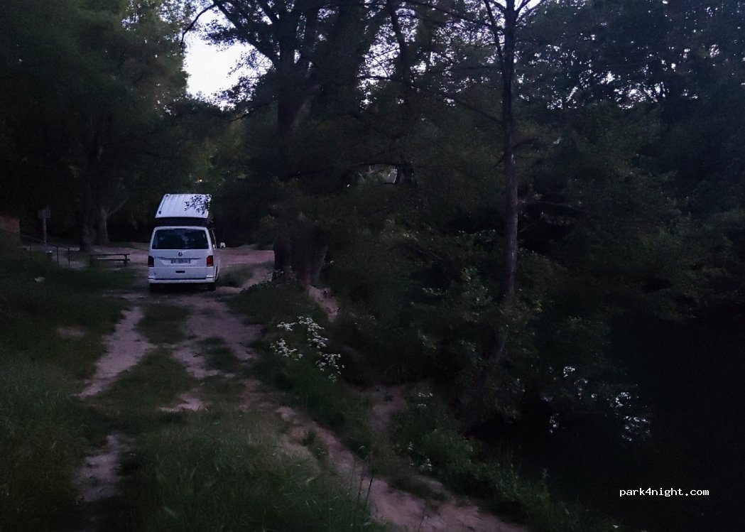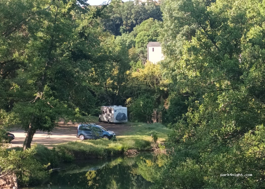 Parking public aux emplacements non délimités. Ombragé calme et au bord de la rivière.