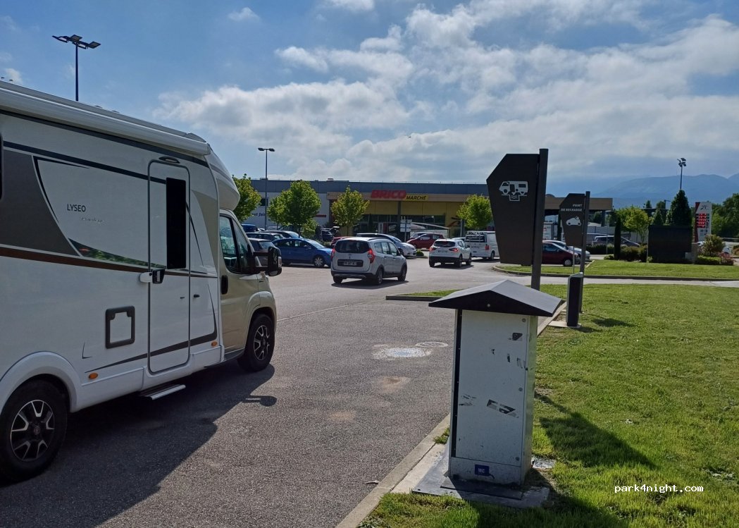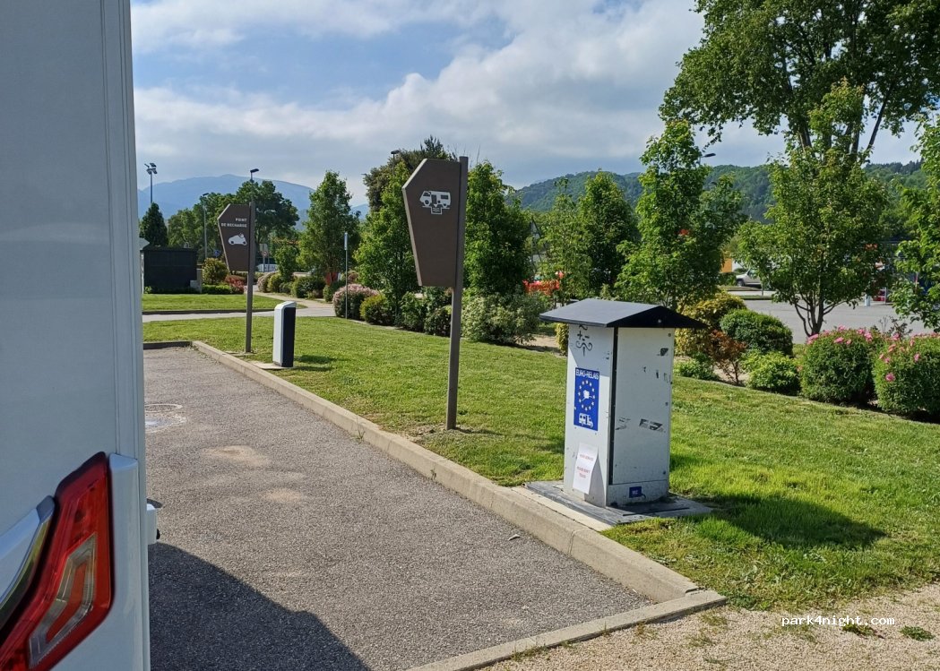 Nous avons pu en ce 28 décembre remplir notre cuve d'eau propre (aller chercher un jeton à intermarché, 2,50€ le jeton pour pouvoir remplir 100l) et vider nos eaux grises et noirs. Tout fonctionnait. Possibilité de se brancher à l'électricité (avec jeton egalement, 2,50€/heure). Pratique d'avoir intermarché à côté pour pouvoir faire quelques courses. Dans zone commerciale avec plusieurs magasins.