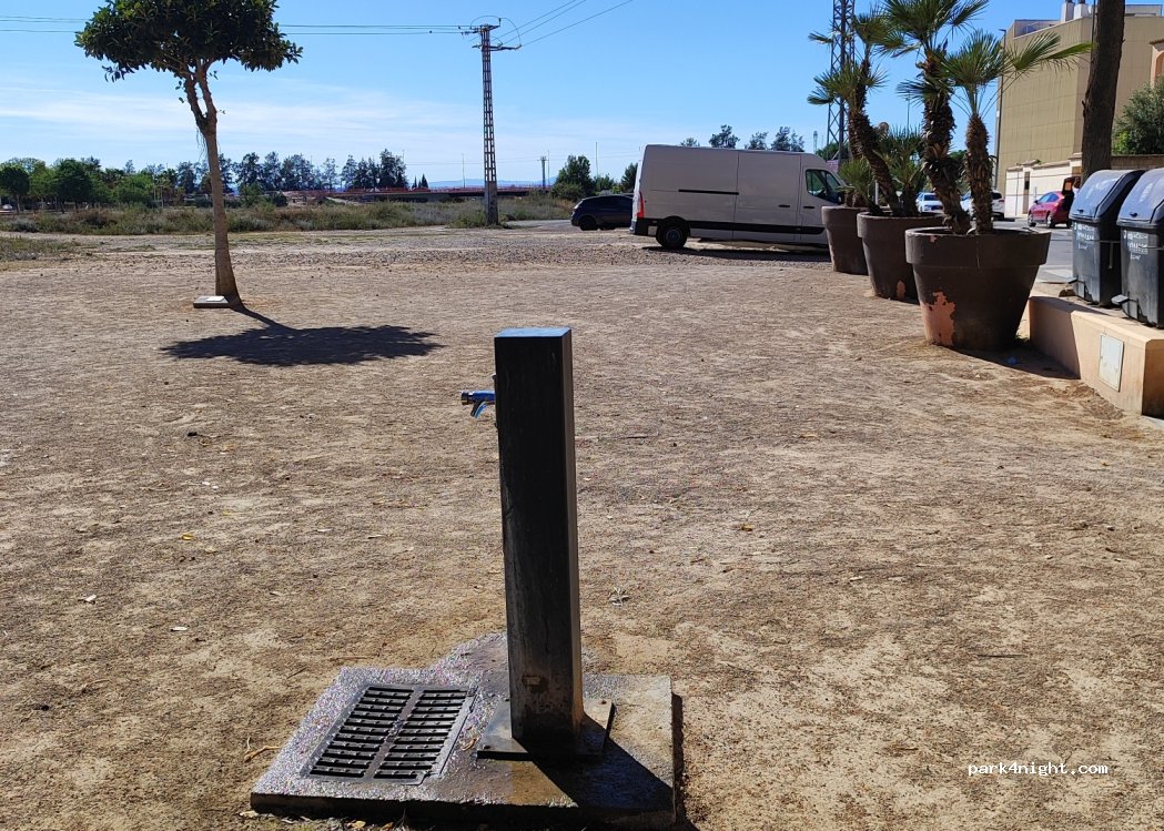 Aparcamiento en las afueras del pueblo con fuente de agua accesible, un parque al lado donde hacer ejercicio y área de paseo para perros
