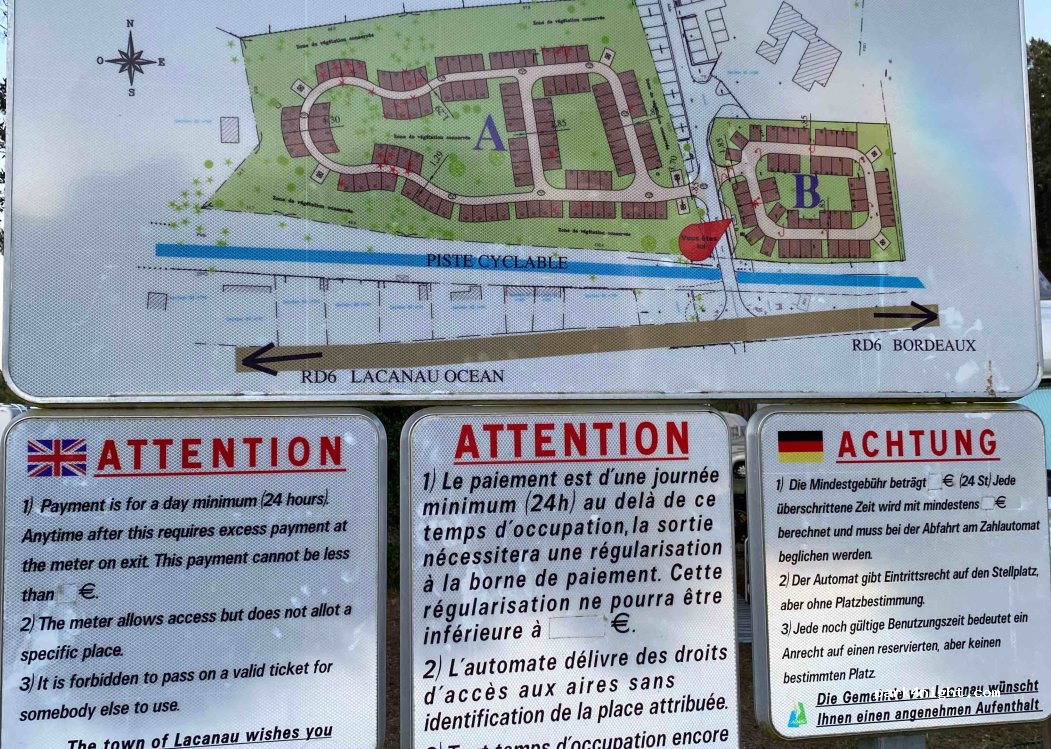 The ”36 available pitches” in Camping Car Park app is a JOKE! I found it rude, inspproppriate and thoughtless, that many people use the area as theit holiday residence, i.e. spresd their stuff, outdoor dining areas, tents etc on the neighboring pitch, limiting the available pitches from arriving guests! clear pitch numbers would be great. 2 stars for location - Lacanau is great for suring.