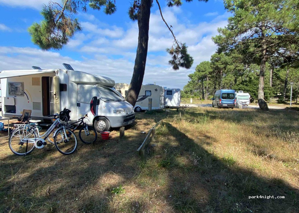 Grands espaces ombragés ou pas, à vous de choisir. Piste cyclable au départ de l'aire. Super pratique. Plages et lac proches, Lacanau Océan aussi à 10 min à vélo. Douche à 3€ & snacks sur le camping voisin. Excellent séjour ! Merci !