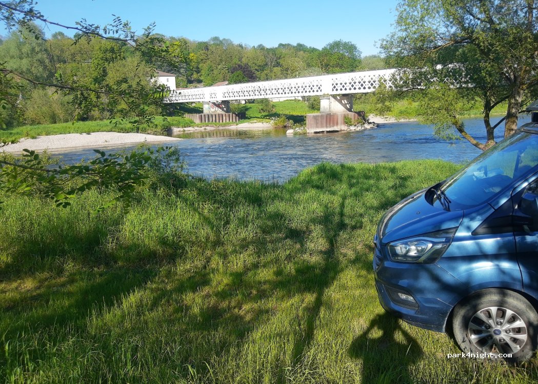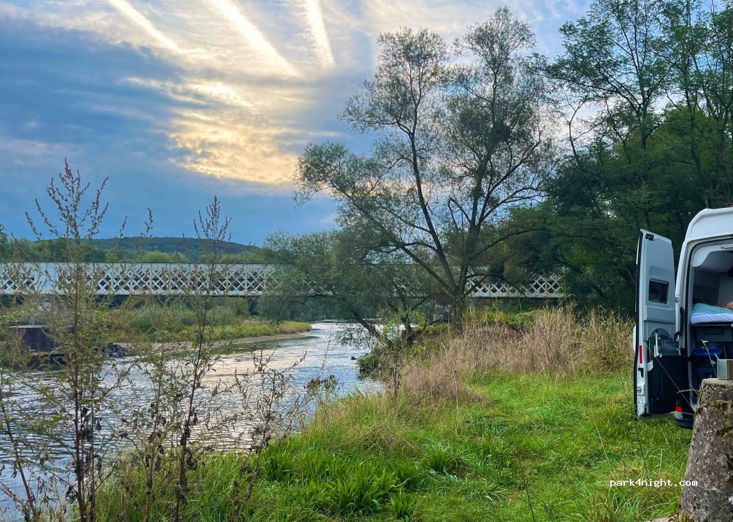 Extraordinary spot, next to the river, bathing/swimming super accessible, I didn't see any signs saying camping is forbidden, only signs saying dumping and bathing is not allowed. Place for multiple vans. Some traffic on the road nearby but limited, very beautiful area, very accessible!