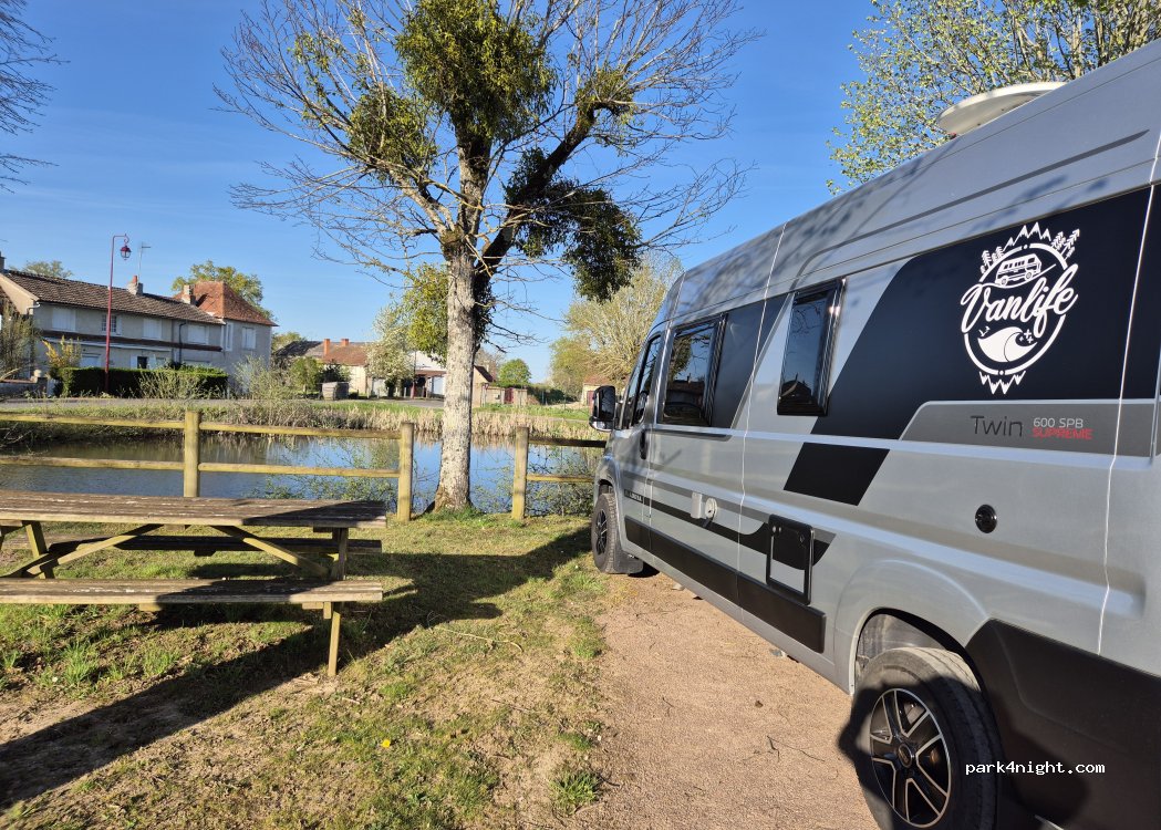 endroit superbe très calme, casi dans le village, avec une mare ou il y a des poules d eau, ragondin, etc. seulement 3 places mais vaut le détour, endroit pittoresque. tout ce qu il faut pour l eau, vidage eau noir eau grise.