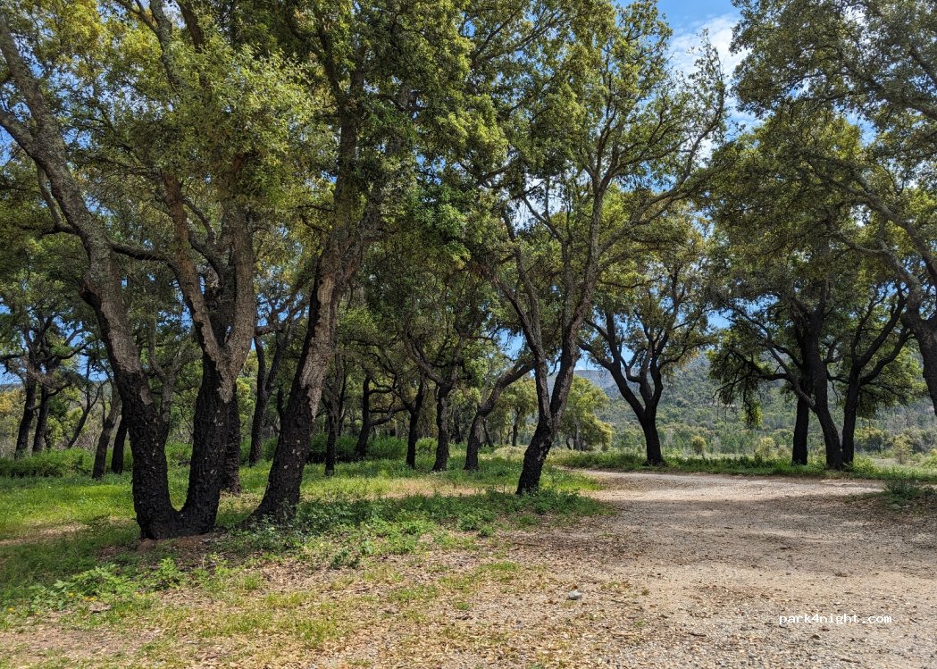 Schattiger Bereich, neben der Straße, aber mit wenig Verkehr, Beginn einer Strecke im Maures-Wald. Biwakieren/Camping ist das ganze Jahr über verboten und Hunde sind nur an der Leine erlaubt.