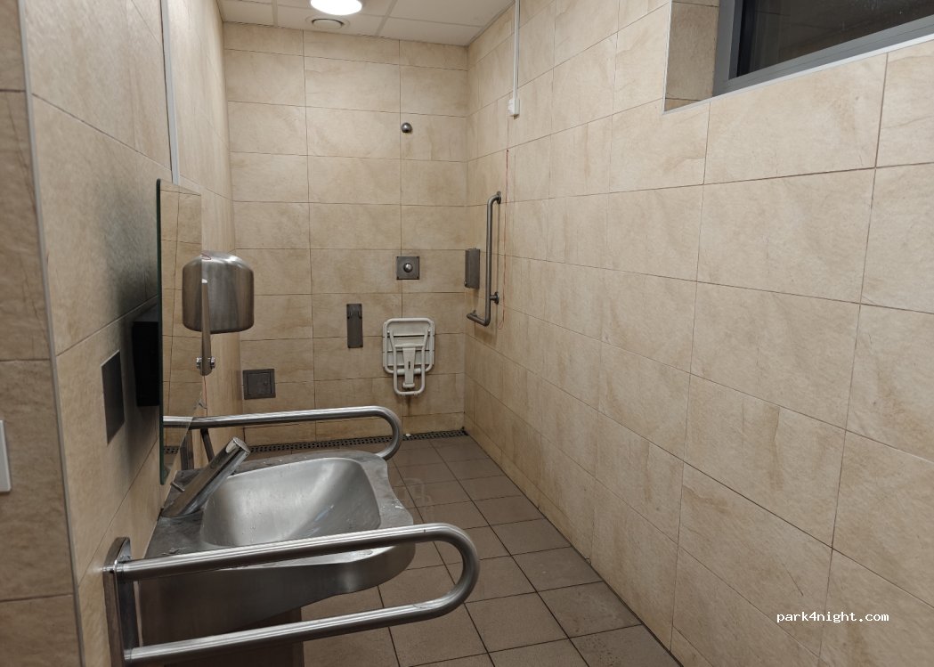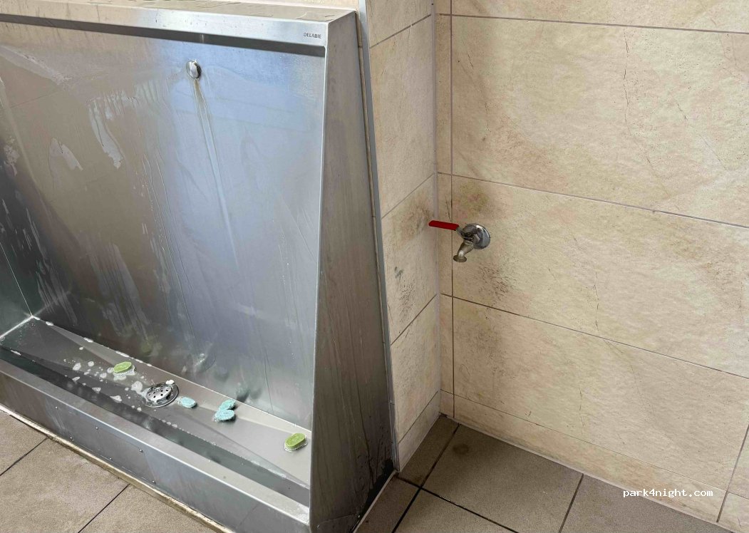 What a great place! Free shower, water hookup (inside the building, a long ways away from the parking! bring a long hose) and toilets of course. The water is warm and you don't even need to bring your own soap! The provided soap looked oddly similar to the hand soap but cleaned me up anyways. One shower per sex, probably busy during the day. Slippers recommended. Looks like a prison shower. 5/5