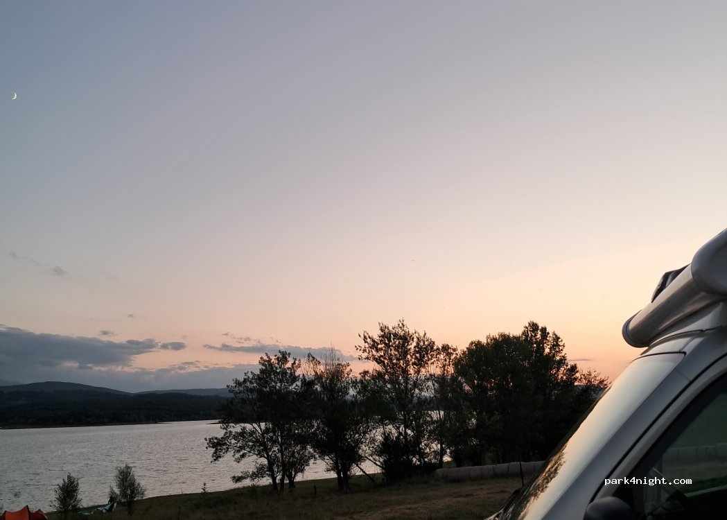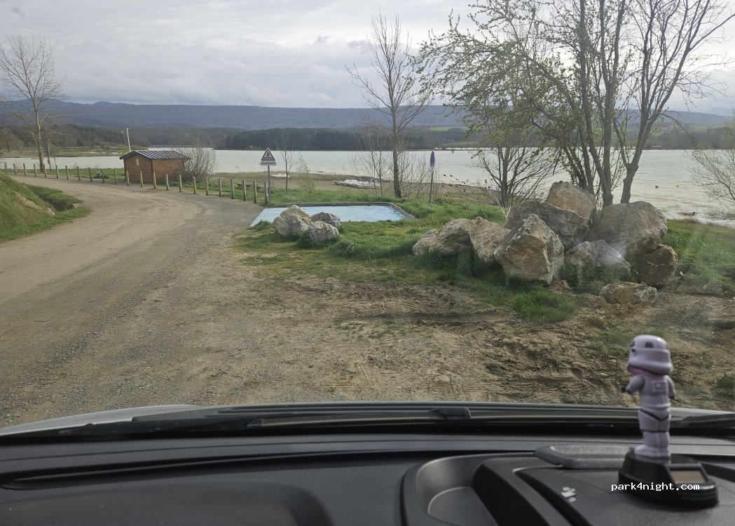 Emplacement calme (malgré un peu de musique techno émanant du bar d'à côté), généralement fréquenté par d'autres voyageurs en saison. Stationnement gratuit, et suffisamment de place pour un camping car. Toilettes publiques gratuites à proximité (200m), très propres, avec possibilité de remplir des bidons d'eau (robinet extérieur). Superbe vue sur le lac, mais stationnement légèrement en pente.