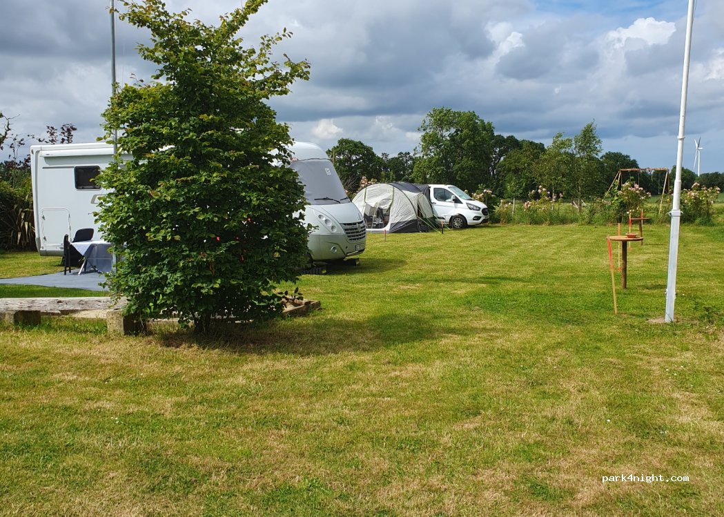 Tout simplement génial !!! Des hôtes hypers gentils et aux petits soins. Des toilettes, une douche, une cuisine, un abri avec des jeux, micro-ondes et tables. Le terrain est plat, super bien entretenu et il y a un bac à sable et des balançoires. Plein d'animaux à voir, et des voitures anciennes pour les passionnés. Allez-y !