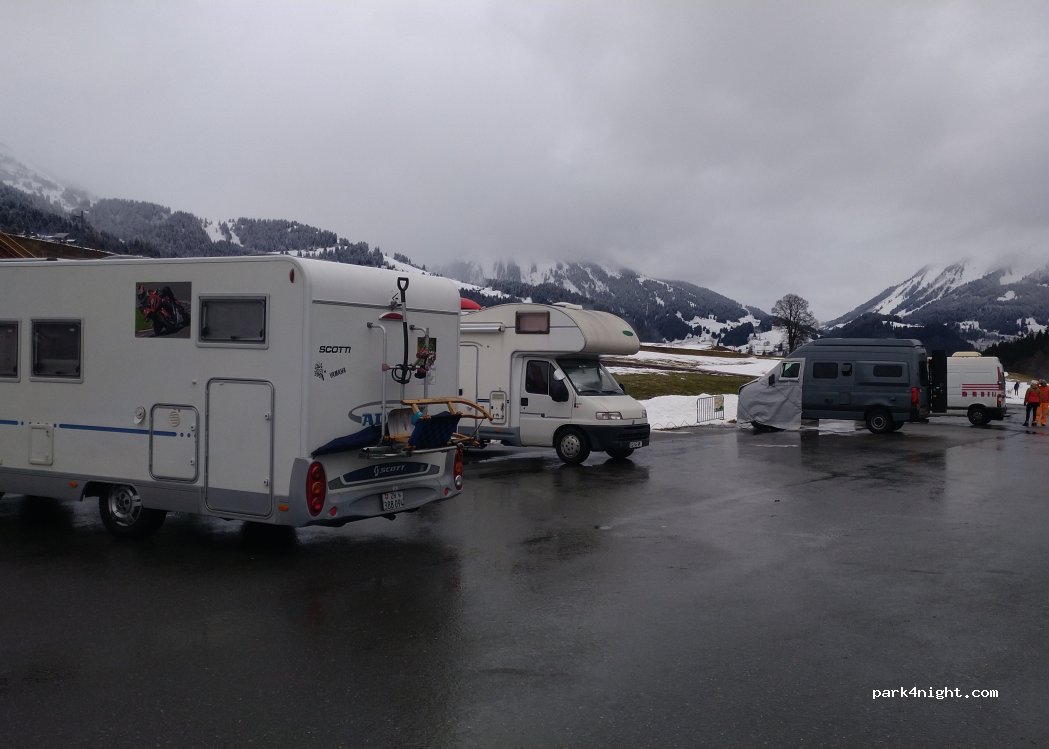 Place de parking avec vue sur les montagnes 15chf possibilité d’électricité, toilettes sèches super propre possibilité de prendre une douche à l patinoire pour 3chf. Départ de rando juste à côté. Très calme la semine, un peut plus bruyant le week-end
