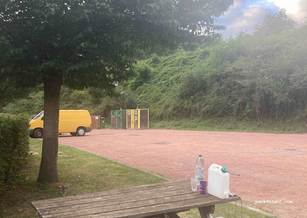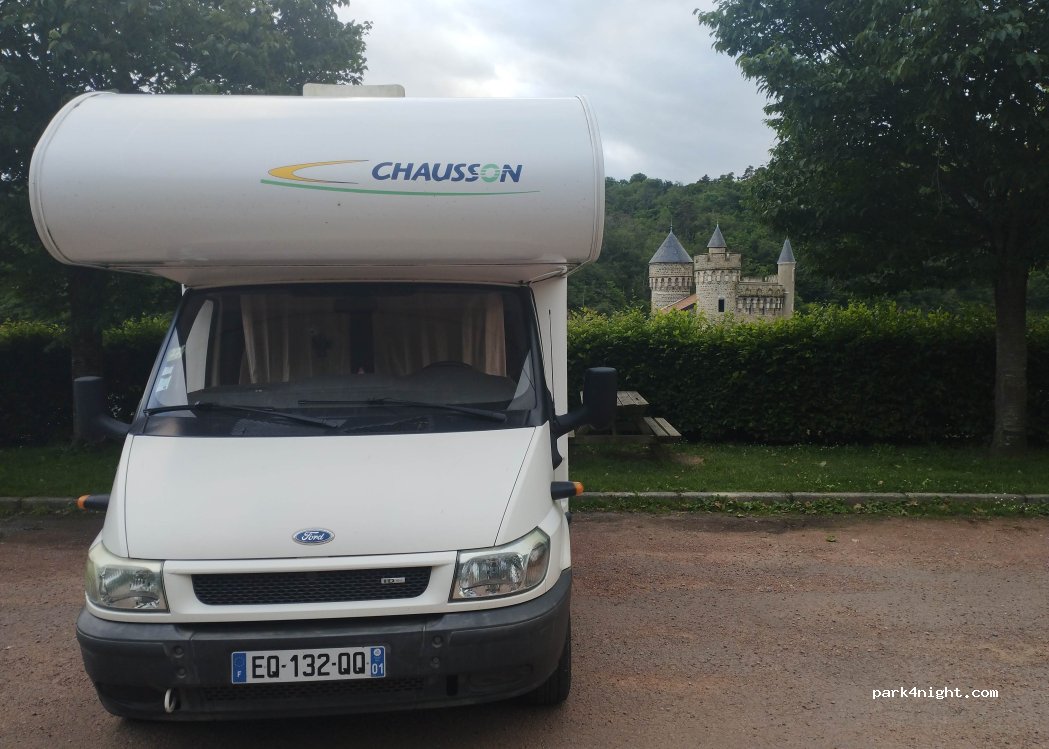 nous sommes restés une nuit, très calme. je conseille de se garer à l'opposé de tables car le lendemain à 7h30 on a du déplacer le fourgon pour permettre l'arrosage des arbres. Sinon top avec vue château.
