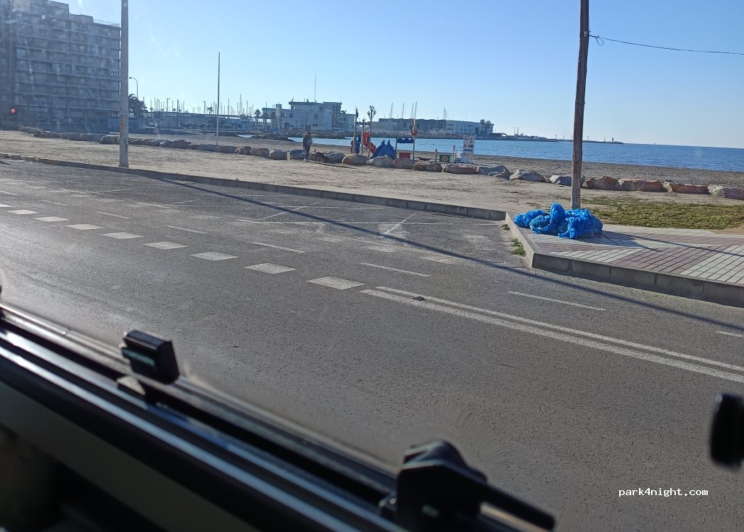 Parkstreifen direkt am Strassenrand, aber auch direkt am Meer. Strasse ist normal frequentiert Für eine Nacht in Ordnung, länger möchte ich hier nicht stehen. Toilettenhaus in direkter Nähe Standort Avenue Vincente de Blasco Ibanez