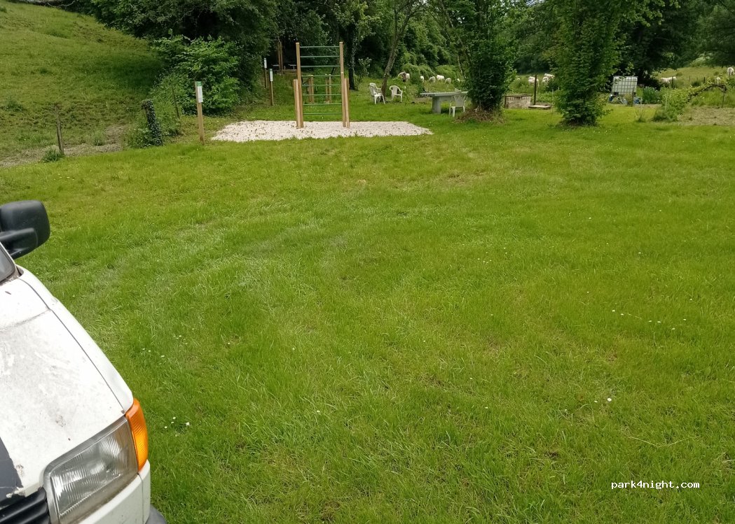 Situated at the edge of a small village on the grounds of a park and cemetery. lovely peaceful setting, however! it's a grassed area and we got stuck, lucky some lovely locals with a tractor pulled us out, they did expect payment, unfortunately we didn't have any cash but they gratefully accepted a bottle of wine each. With the likelihood of getting stuck again, we chose not to stay the night.