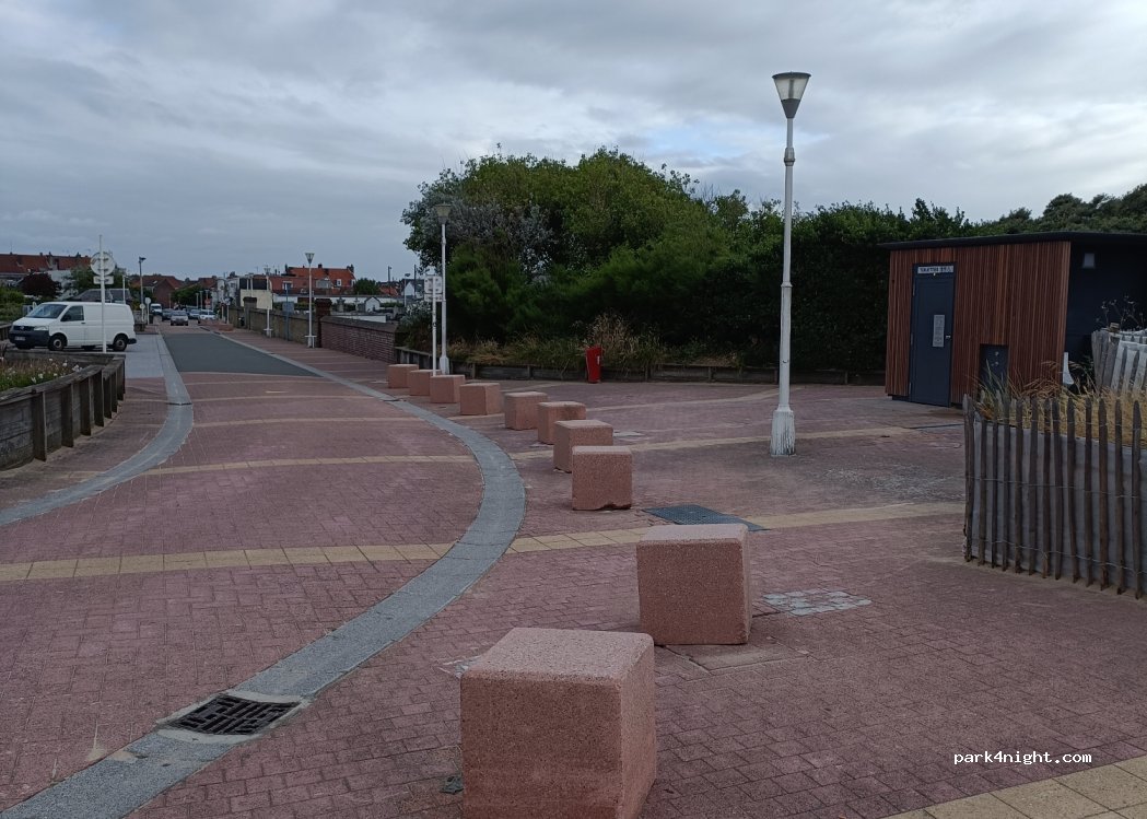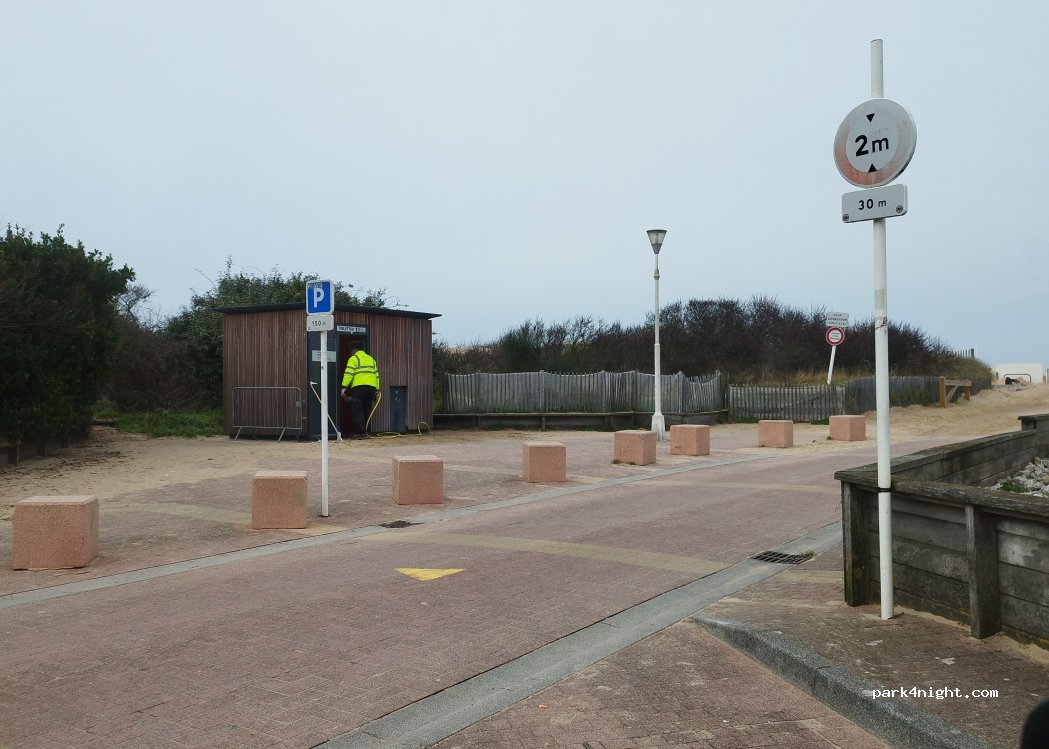 Parking alongside the cemetery and with direct access to the beach. No passage during the night. Woke up at 8 a.m. by the noise made by the municipal employee sweeping the sand from the sidewalk! Parking possible for a 7.5 m groyne. Sea view. Spot probably very busy in summer. The 2 m height limitation only begins at the end of this small car park.