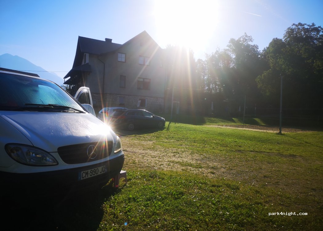 An amazing find and much better than any aire (which is more expensive) would offer. When we arrived people were parking considerately leaving enough space for awnings although as we left people were parking like sardines so it may be a matter of luck how much space you have. Bled 15 mins away, vintgar shuttle bus 10 mins. Lovely owners and wished more places like this exist