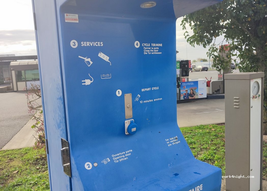 Sehr guter Stop für services. Alles praktisch an einem kostenlosen Automaten, direkt links neben der Tankstelle. Frischwasser mit Zapfpistole. Man könnte hier auch gut Pause machen oder sogar übernachten, wenn man einen Zwischenstop an der Autobahn braucht.