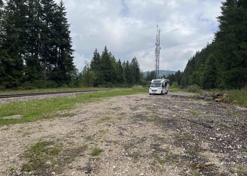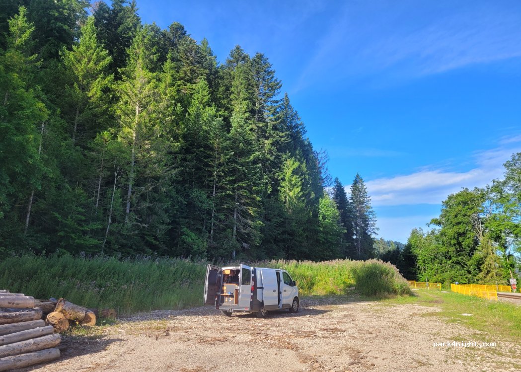 Very quiet gravel parking lot, little traffic. Departure for hiking. Next to the railway line but no train, the watchmakers line being closed until the end of 2024. Plenty of space and a second car park further away. Very correct access road. Not very far from the center of Villers le lac, about 10 minutes by bike. All shops present in the center of the village.