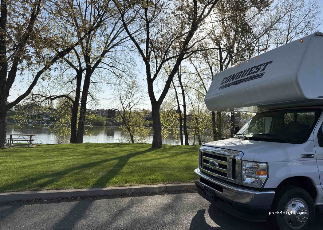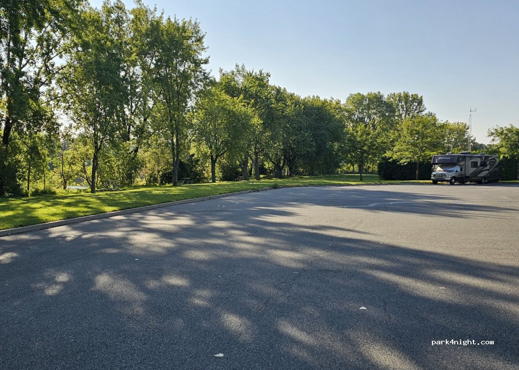 Beaucoup de place. grand stationnement assez plat, pas besoin de niveller votre VR. bord de l'eau, mais l'eau est verte et brune, "burk!" les lumières dans le stationnement ne nous ont pas dérangé endroit tranquille.