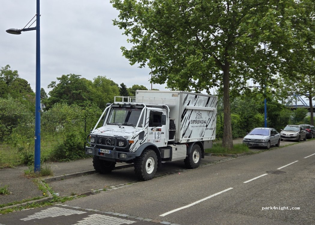 Bon parking proche de la gare pour visiter Strasbourg. Aucun problème pour passer la nuit, idéal pour les gros camions (nous avons garé notre Unimog) et gratuit/sans limite de temps. Également très calme jusqu'à 6 heures du matin, lorsque certains trains commencent à passer (ce n'est toujours pas un problème).