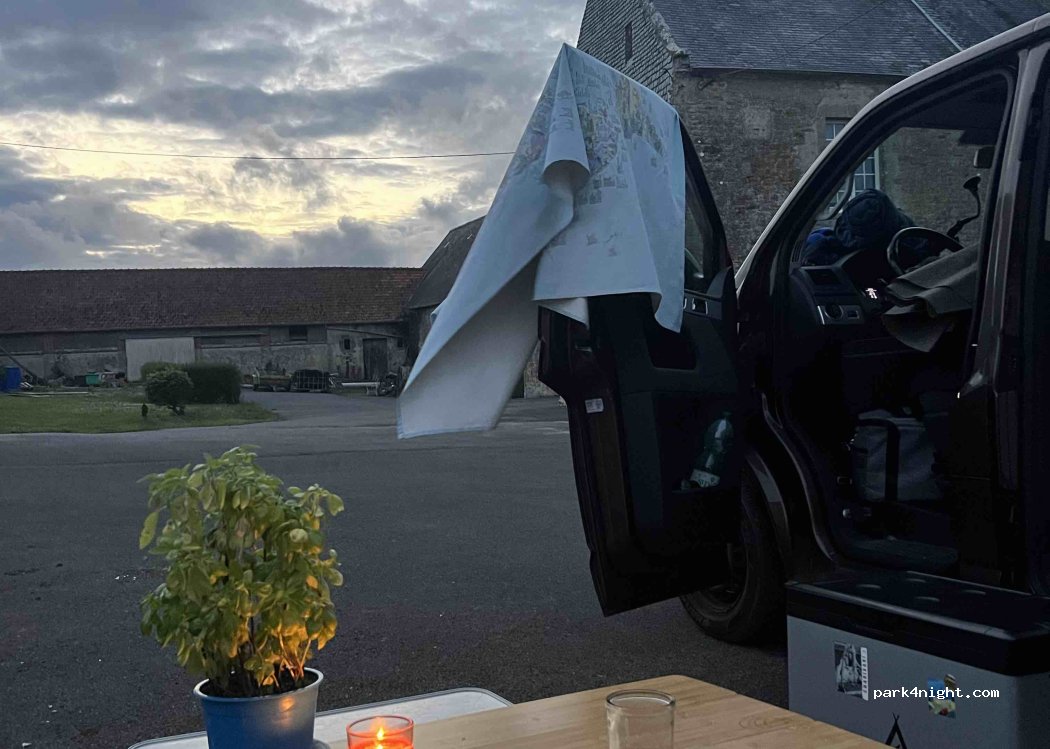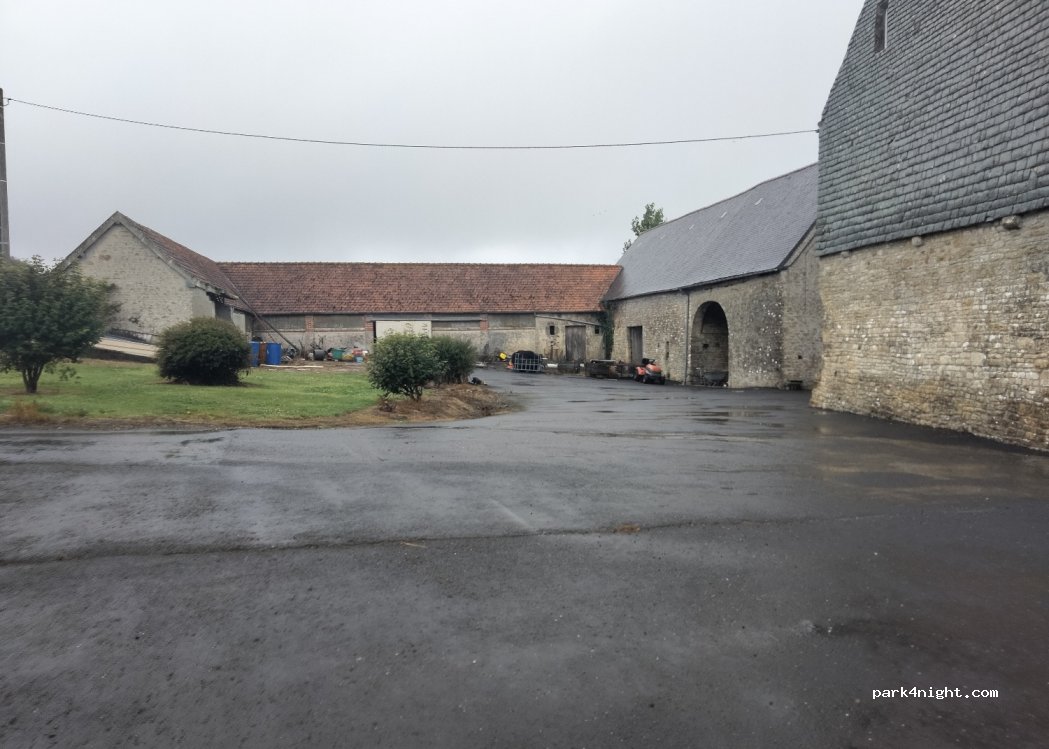 Toller Ort für eine Nacht, mitten im nirgendwo, zwischen den alten Mauern des Milch-Bauernhofs und umgeben von 80 Kühen. Super freundlicher Empfang von Benoit, wir durften uns den platz selbst aussuchen. 2 Toiletten und eine Dusche in einem geräumigen Container. Sehr sauber, keine Massenabfertigung. Wir haben uns sehr wohl gefühlt! (18€ für 2 Personen und Hund, inklusive Strom .)