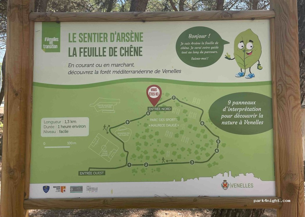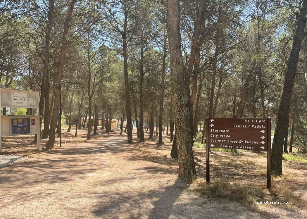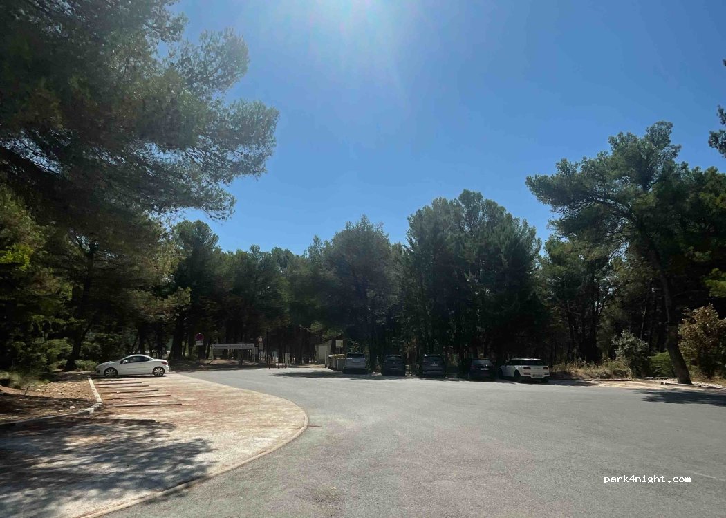 Nous sommes partis de Simiane a 23h car trop bruyant pour se réfugier ici. La nuit était très calme, beaucoup de sportifs et de promeneurs viennent se garer le matin, mais ils sont tous très silencieux. Il y a une balade d’1h a faire dans la forêt, un skatepark, terrains de tennis, city, etc… plein d’activités d’extérieur possibles. C’est un super spot avec une belle vue sur la vallée à travers les arbres.