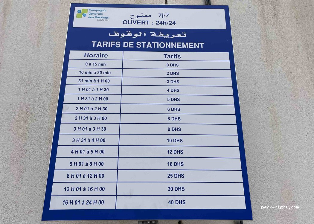The parking lot is open 24 hours a day, is fenced, safe for us, and the staff is nice. We arrived in the evening at 8 pm and left the next day at 3 pm and paid 40 dirhams. Super price for comfort, in a clean and safe place just a few meters from the medina.