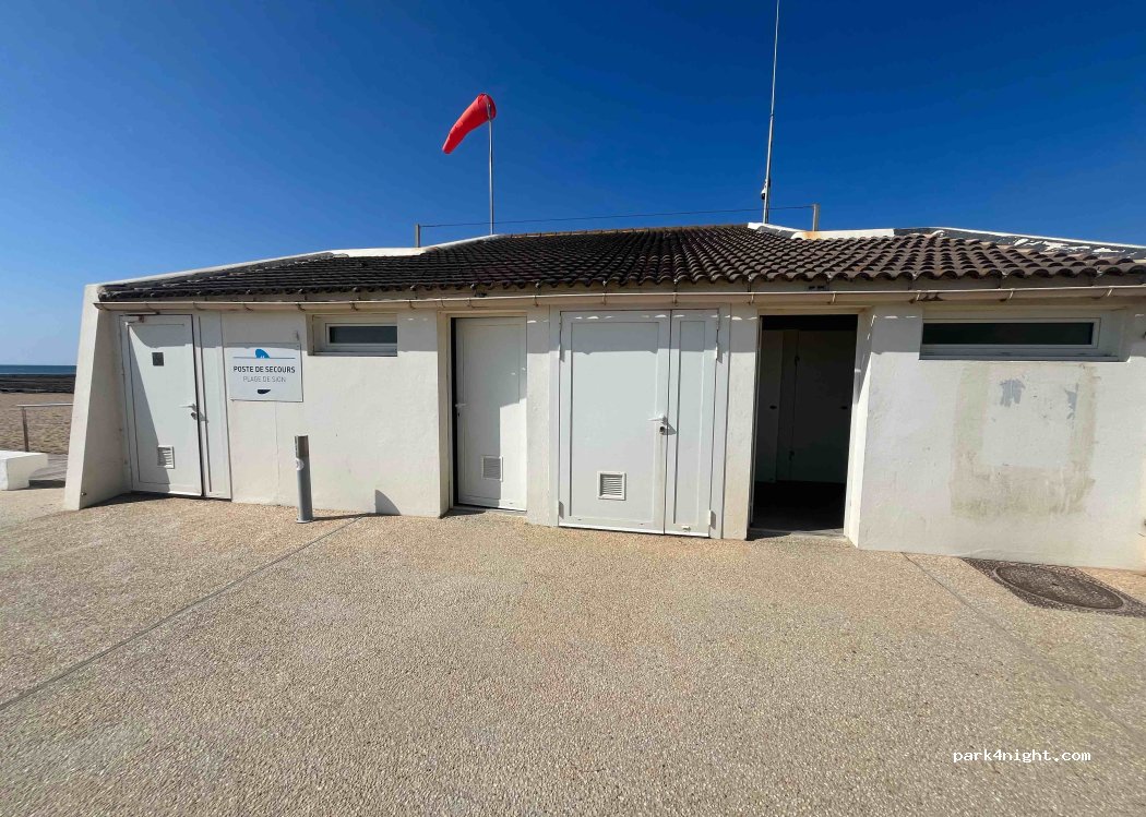 J suis resté hors saison 27/10;pas vu de parcmètre; toilette au poste de secours de la plage au bout du parking.