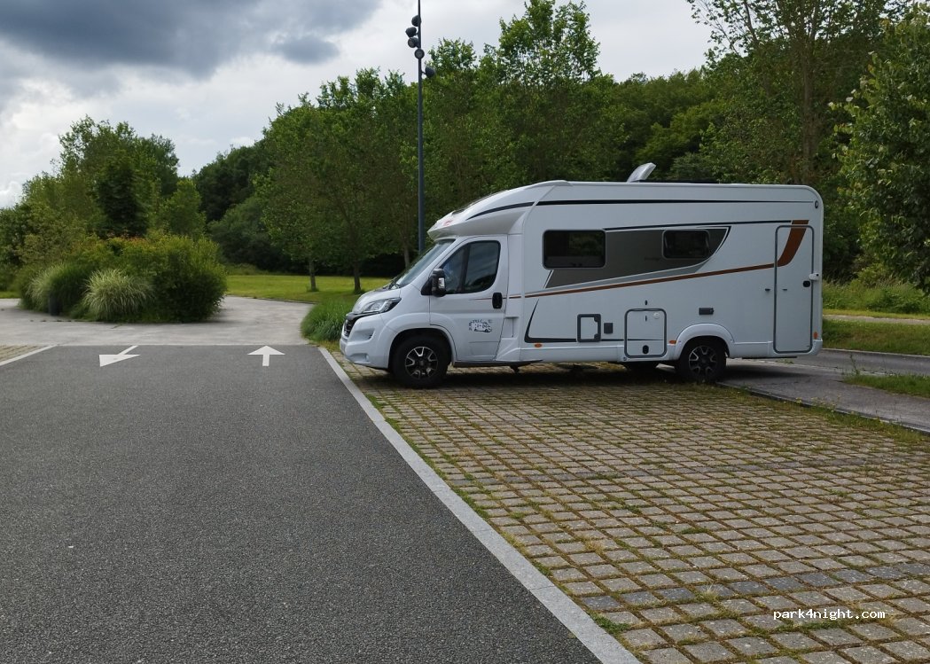 Station parking lot, flat. It is better to park at the back. On the edge of the forest. Quiet at night. Camera and gendarmerie patrols regularly. Quite a few trains. 400 m from the town center (coast to access it). Many shops and restaurants. A must-see glass museum. Departure for walk. Skatepark 250 m away.