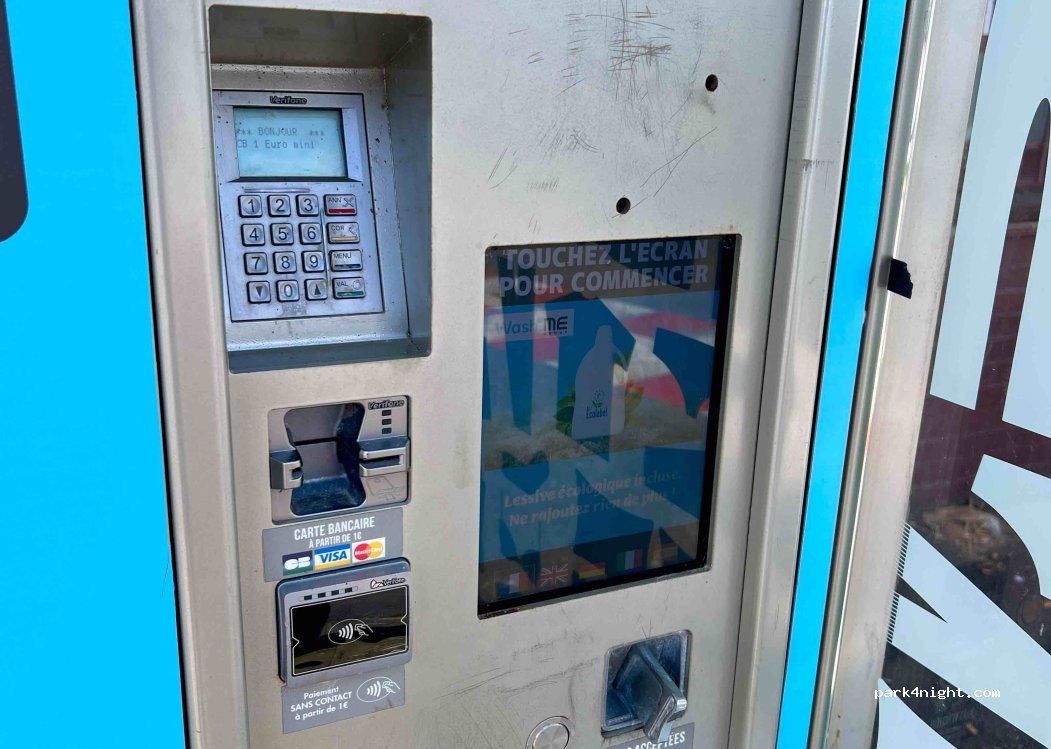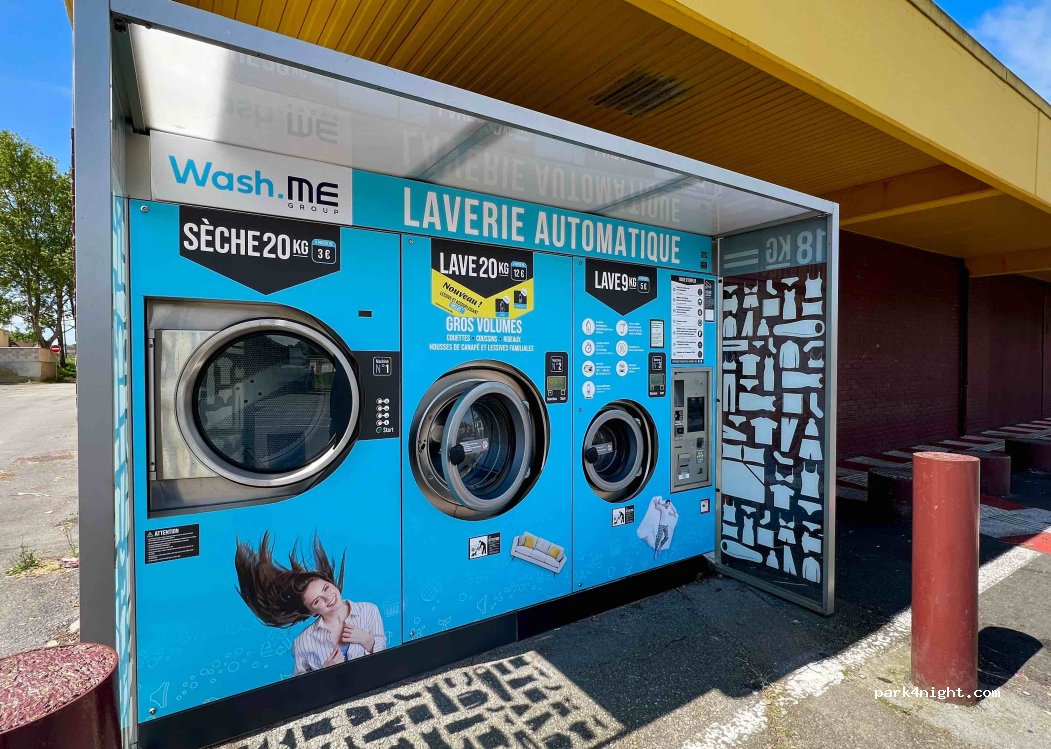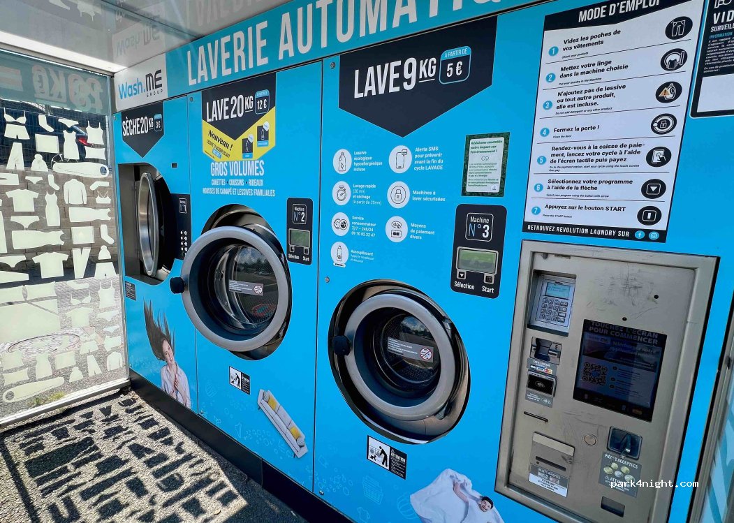 1 machine de 9kg, 1 machine de 20kg, 1 séchoir. Garez-vous devant le supermarché.