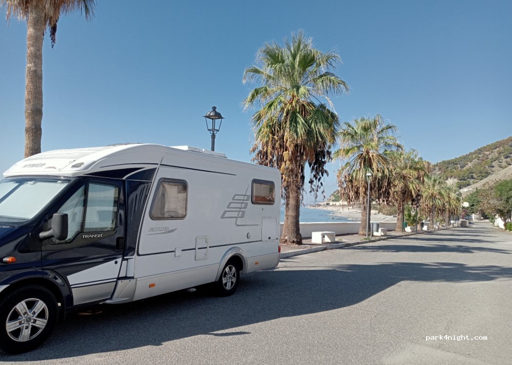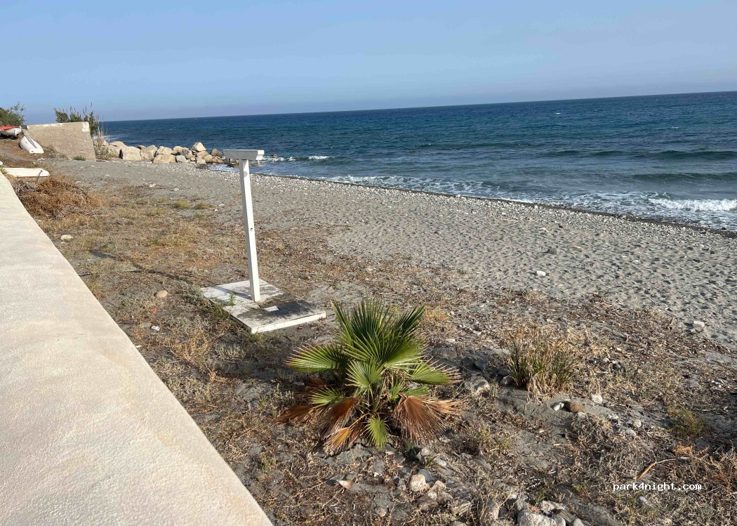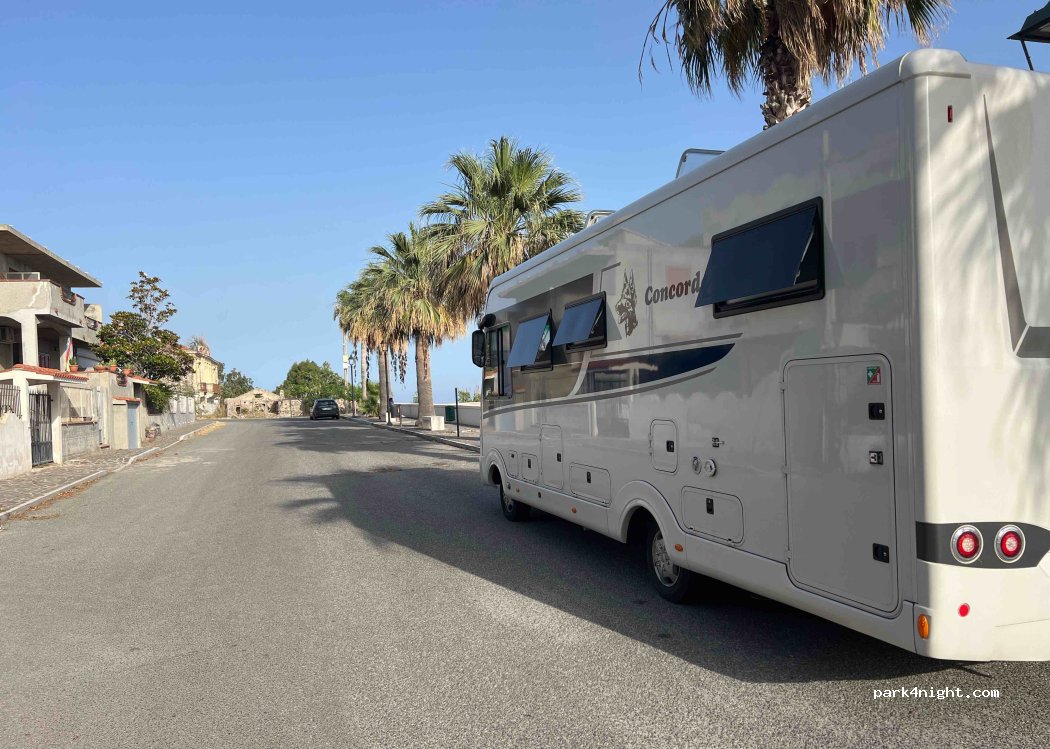 Road directly by the sea with palm trees. Sandy beach with shower and a pizzeria. Access via a railway crossing with barriers, so suitable for all sizes. After the barrier, go straight on and do not turn left!!