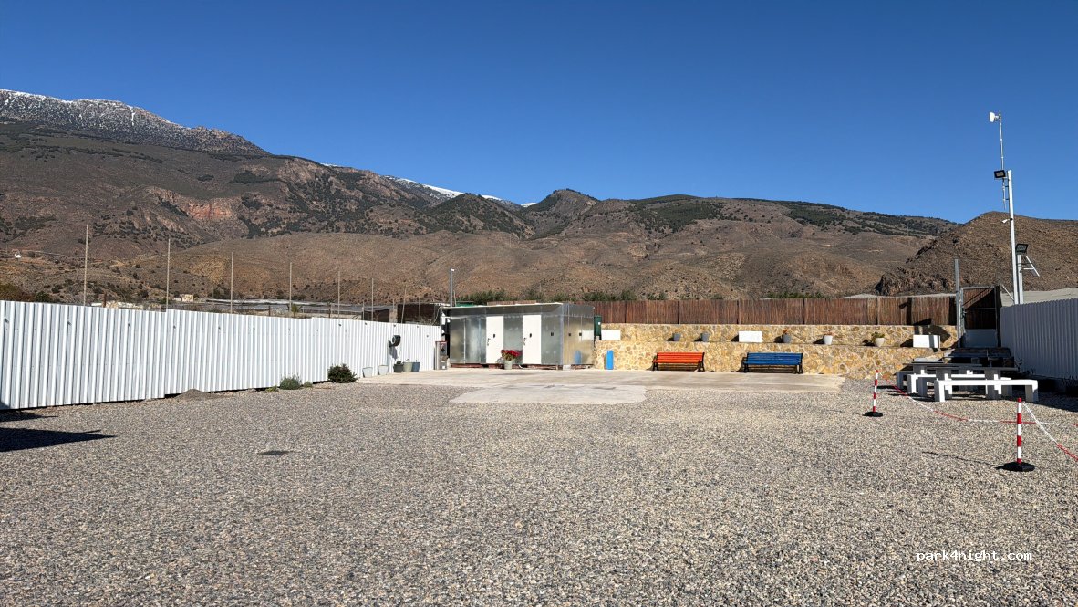 Espectacular. Sitio con plazas muy amplias. La zona de baños está limpísima y es un lavabo amplio. El dueño es súper atento y te da todas las facilidades.. Las vistas a la montaña de Dalías es preciosa por la mañana. Le quedan algunos detalles para terminarla,pero poco a poco que acaba de abrir el segundo parking.
