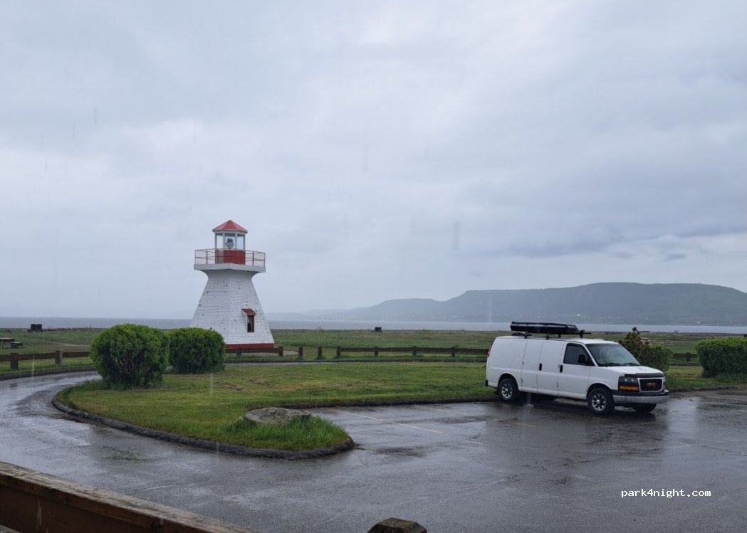 Stationnement du phare de Carleton, aucune signalisation indiquant une interdiction. Ensuite tout près du camping, pour voir si nous étions autorisés car basse saison.