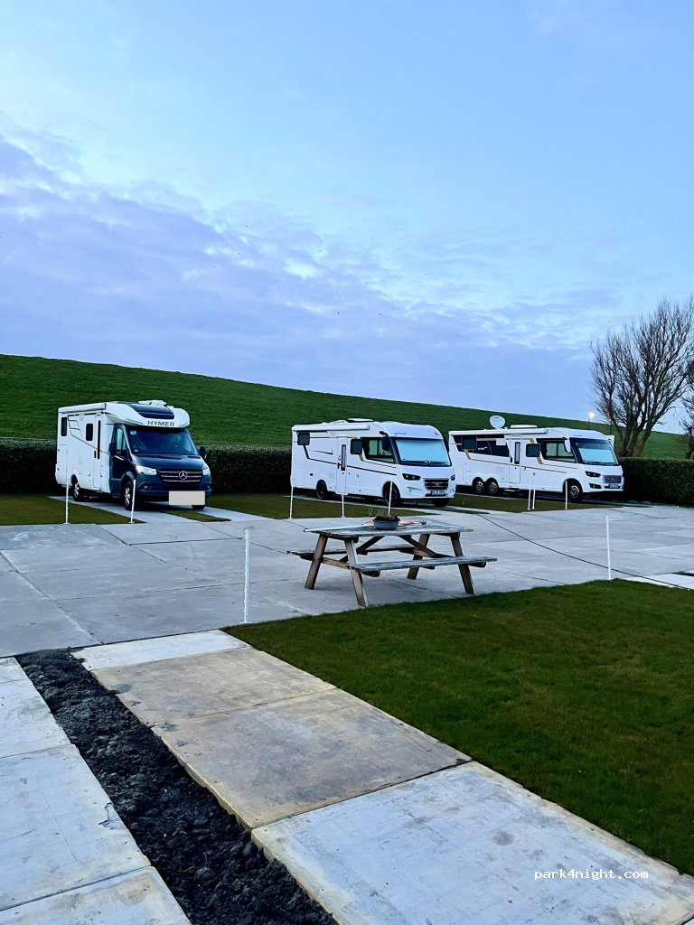 Six emplacements pavés pour camping-cars, chacun avec sa propre petite pelouse.