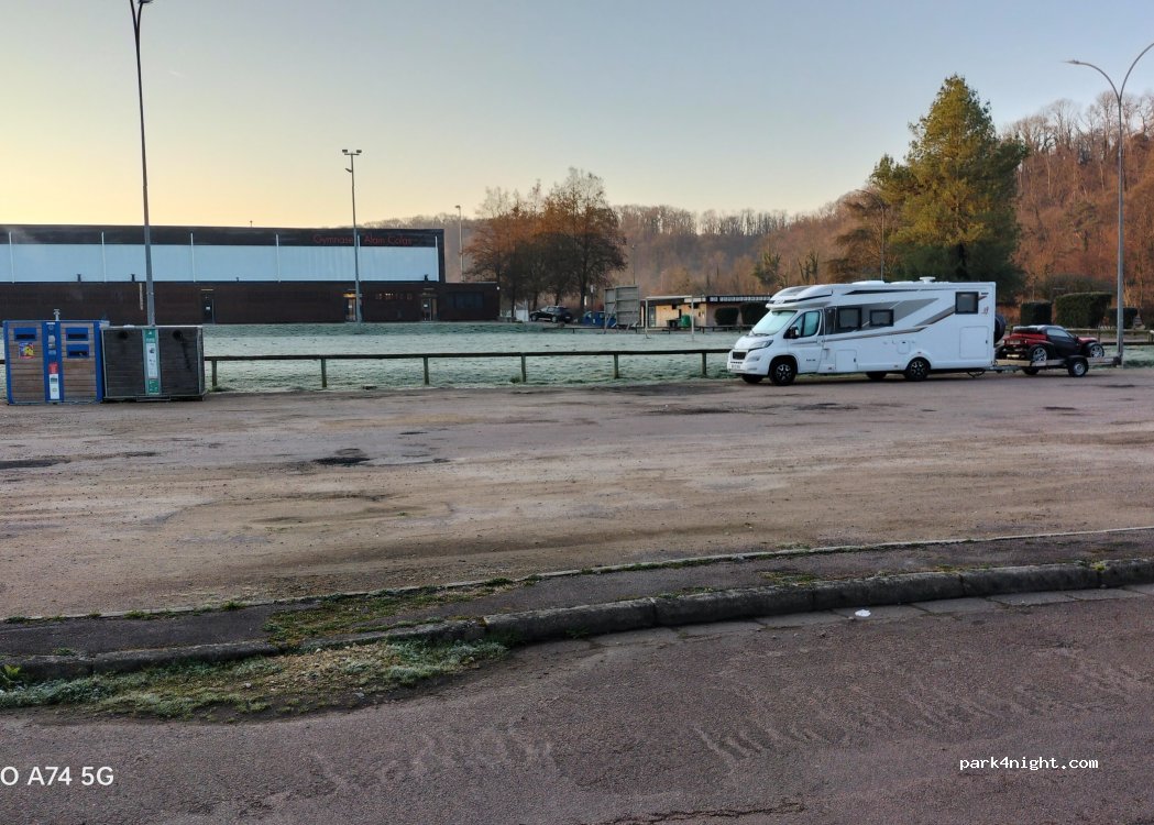 beaucoup de va et vient de voitures en raison du complexe sportif, mais l'endroit est calme la nuit, sur terrain dur. la rue de la graviere est etroite et en pente, ça passe avec un 7m50 et une remorque. pas de services, juste des poubelles. pas de barriere a l'entrée.