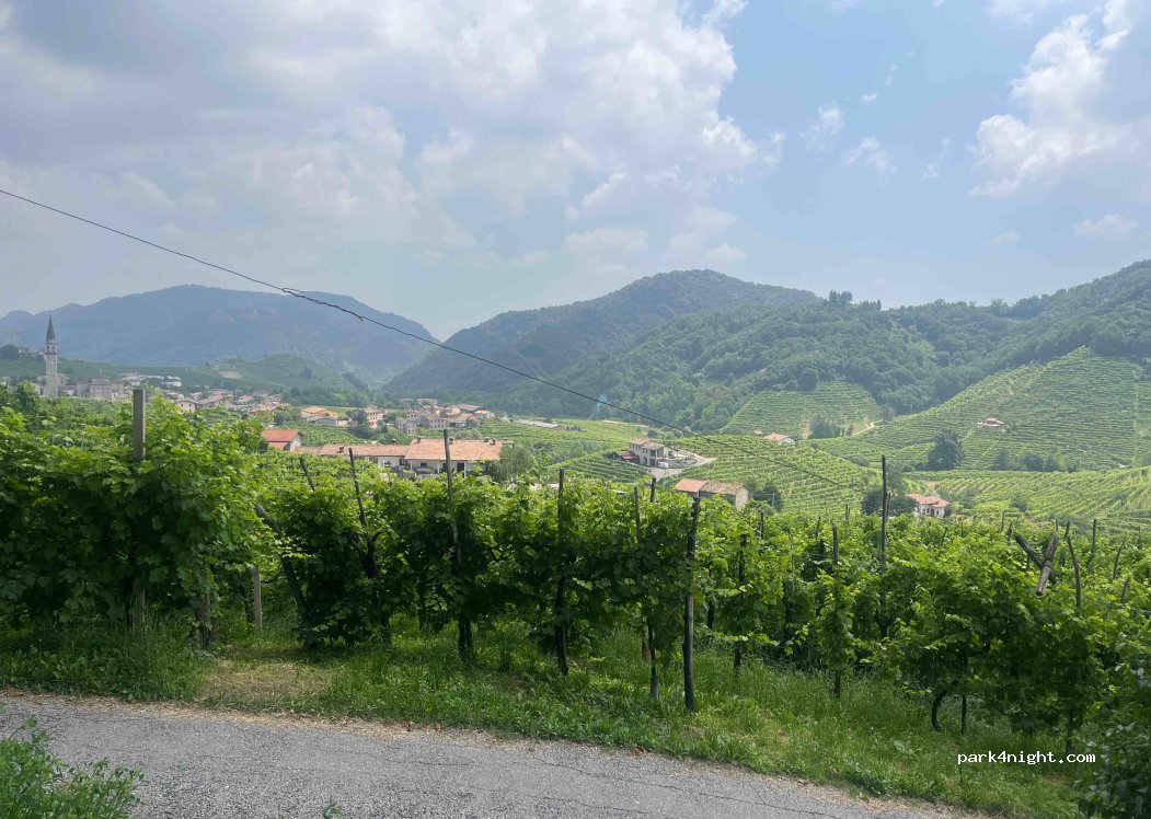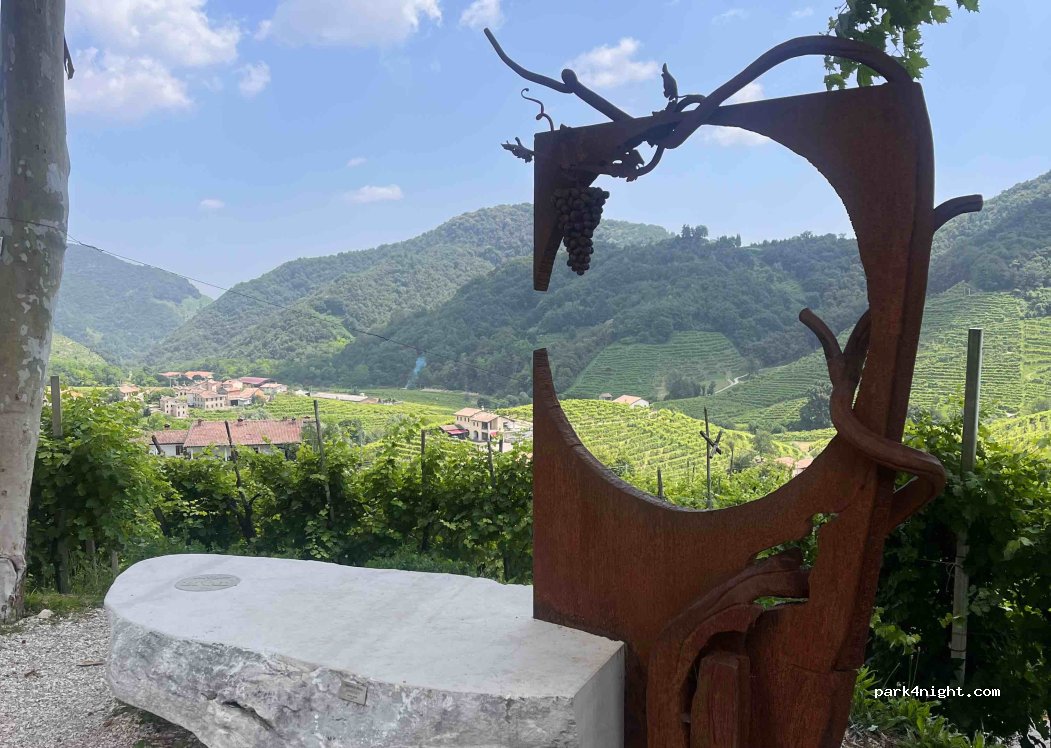 Magical viewpoint over the Prosecco hills, 2 squares and a stone stele to sit down and eat quickly! Wineries not far away for tasting/purchasing Prosecco.