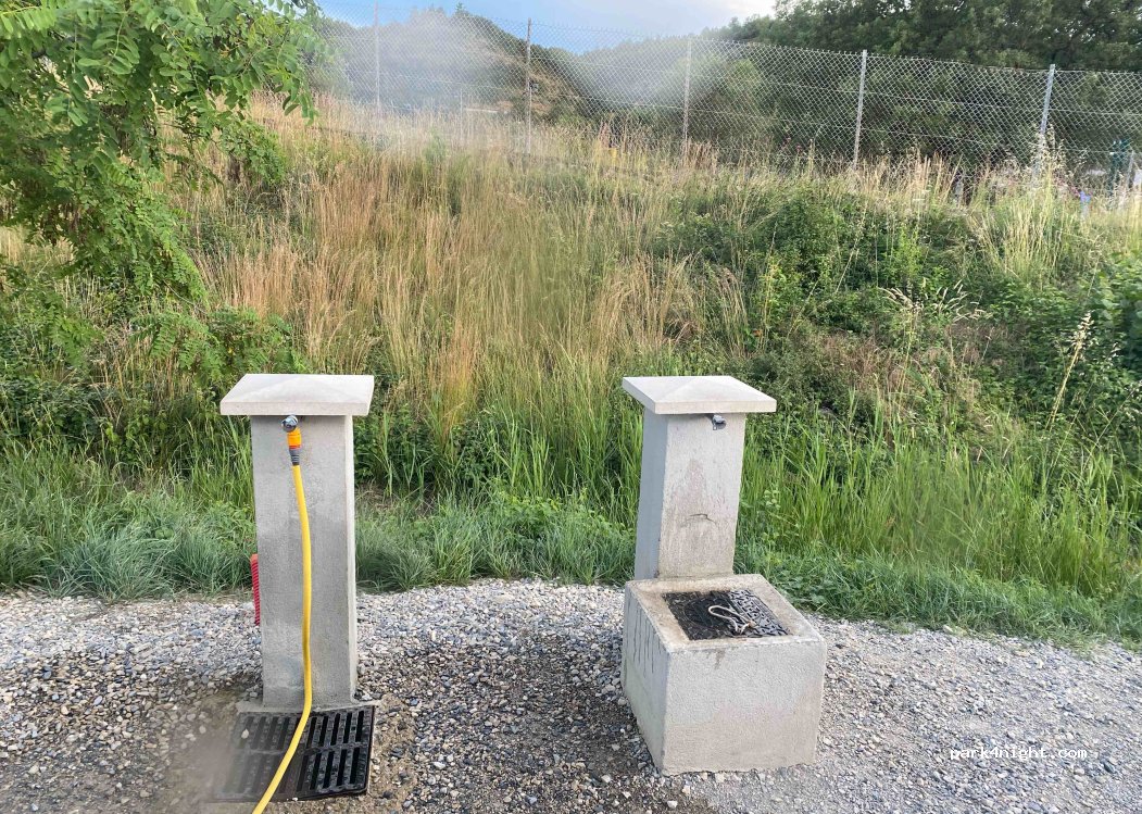 Accès possible à l'eau et vidange eaux sales près des containers de recyclage. Par contre, accès fermé au parking CC.