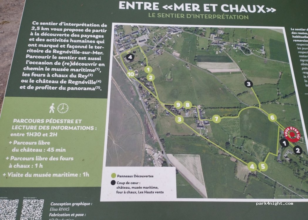 Hyper tranquille, entre les vaches et les prairies. Stationnement dans le fond du parking sur un terrain herbeux. Profitez en pour faire la visite gratuite d'une heure des fours à chaux. Sans oublier le sentier de découverte de 3km qui vous conduira jusqu'à Regneville