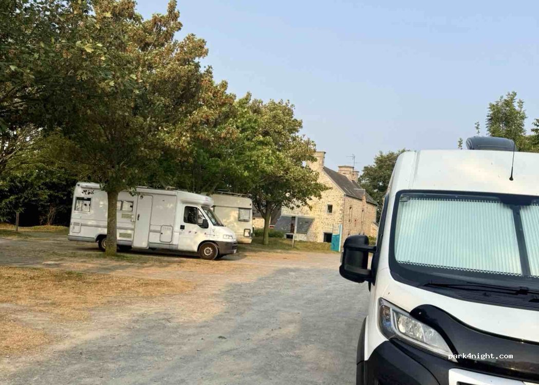 à 1km du bourg en pleine campagne.stationnement ombragé en plein vent superbe vu sur les champs et de loin la mer. aucun service mais je remercie la commune de nous accepter. ce soir nous sommes dix. attention c´est le parking du musée ne soyons pas trop nombreux en journée