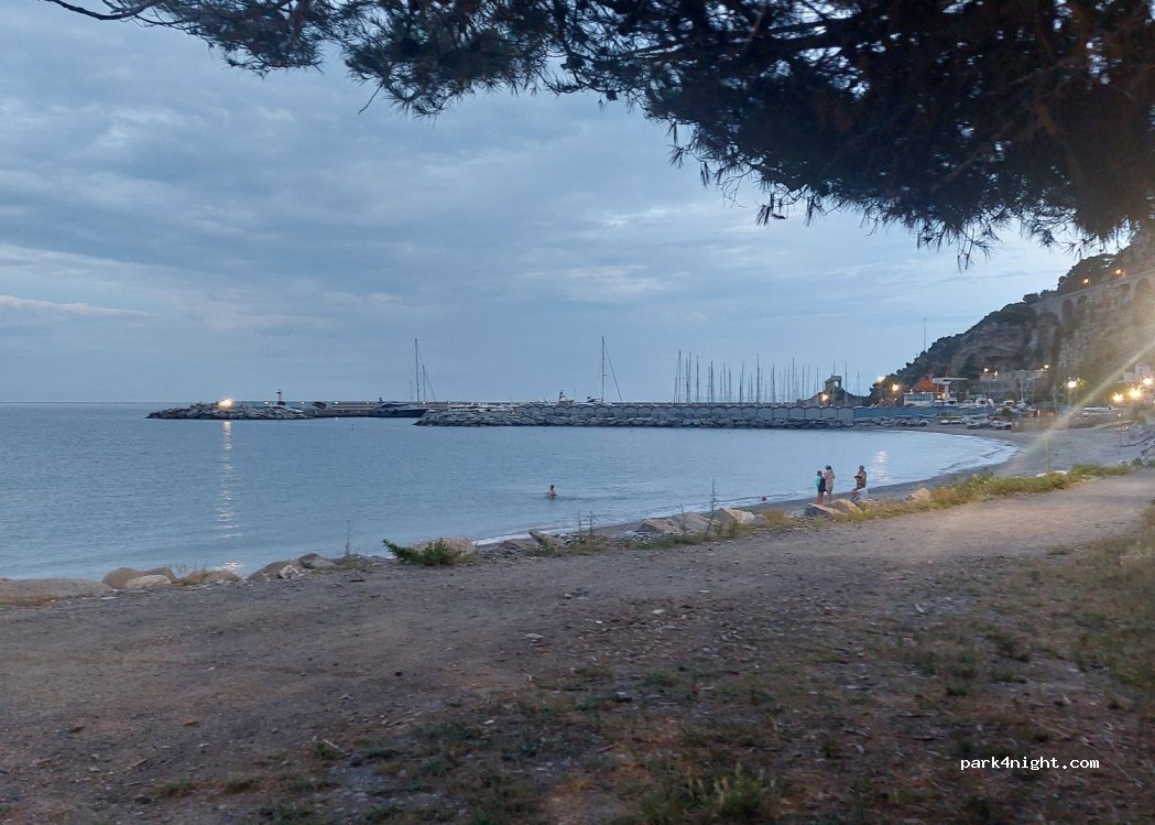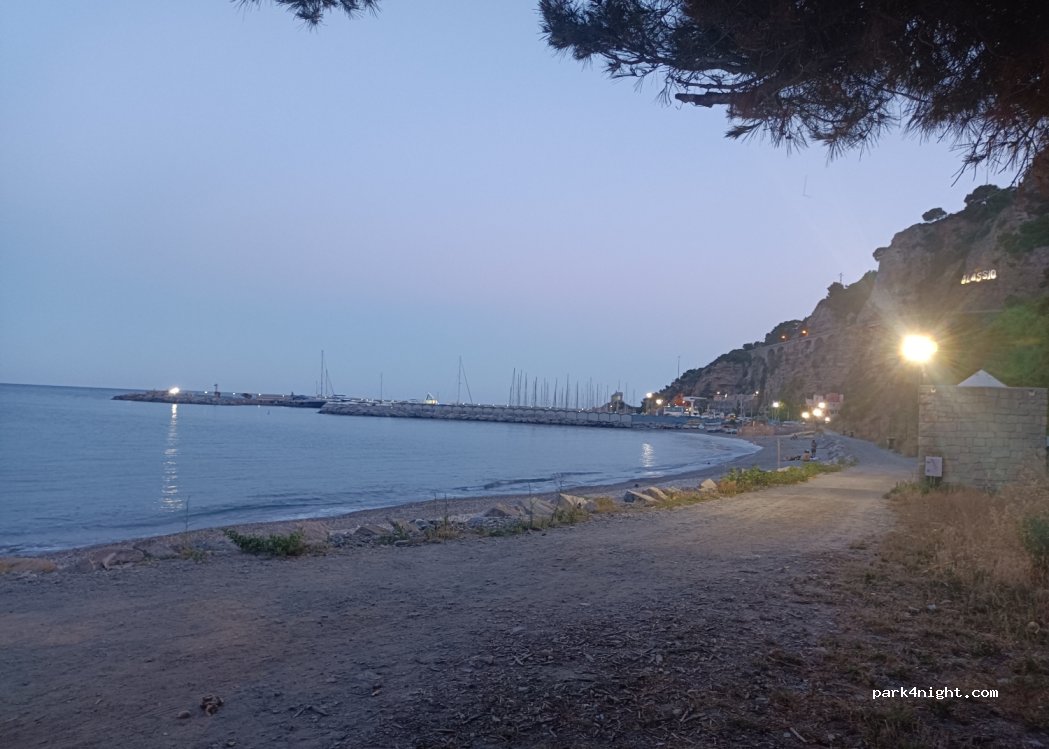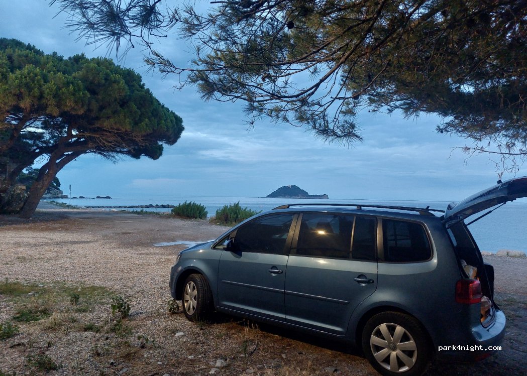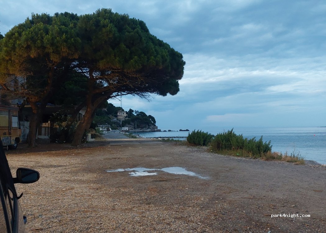 Parkplatz direkt am Meer mit Meerzugang und Badestrand. Anfahrt sehr steil und eng. Nur mit Auto möglich. Abends haben bei uns Wildschweine vorbeigeschaut (wahrscheinlich vom Essen angelockt), mit einem Kreis aus Kerzen um uns, kamen sie nicht näher und sind irgendwann gegangen. Zug fährt nebenan. Von 23:00-05:00 ist es aber ruhig.