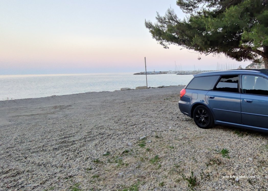 Only for cars/small vans!! The spot is right on the beach in walking distance of Alassio (10min) and Albenga (50 min). You access it by a very narrow road under a little tunnel (height limit), it's on the opposite side from the beach bar parking (turn right after little tunnel). there are public toilets a few minutes away in the port. the train is noisy but ok for a night or two