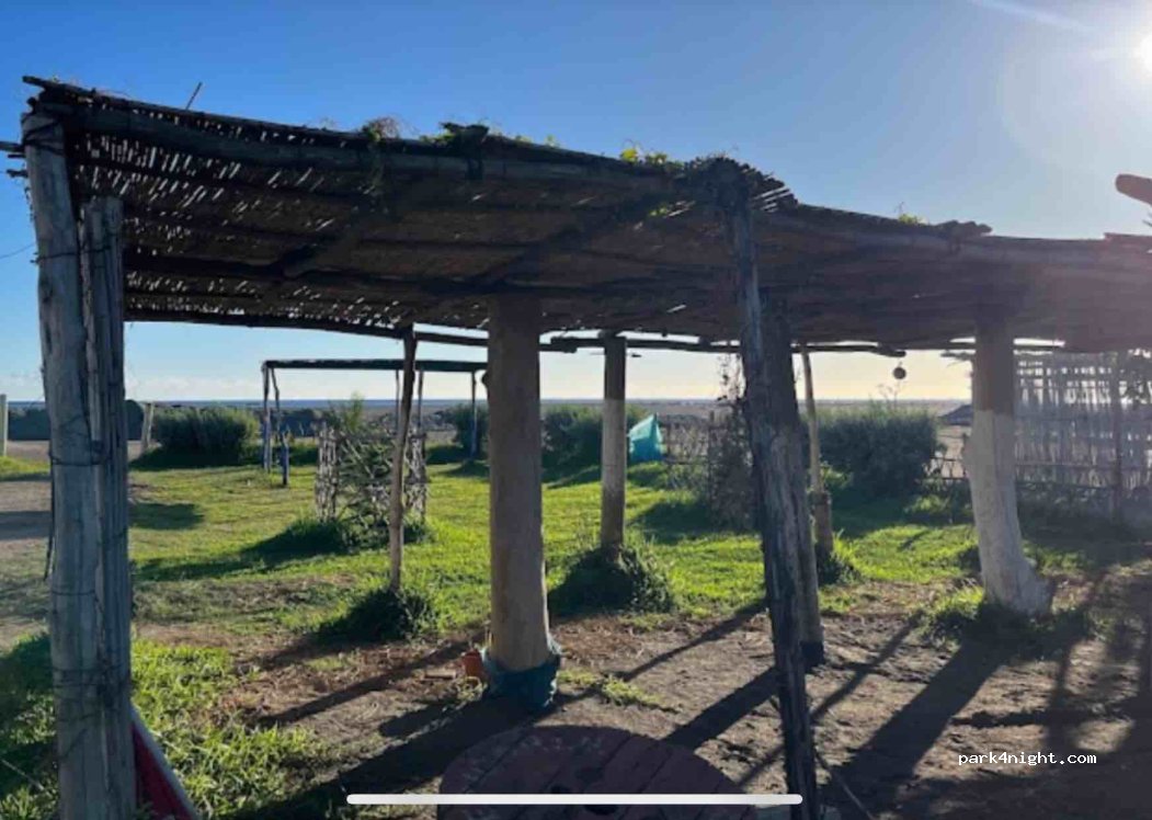 Very rustic little place. Close to beach but not the cleanest & a few packs of dogs. Very peaceful surrounded by farms. We enjoyed a lovely afternoon in the sun. Flat unmarked pitches on gravel. Two clean squat toilets which are good for black waste. I didn’t try the well for water. Couldn’t find shower. Very quiet deserted town on that side, though the centre c 20 mins walk has market and shops.