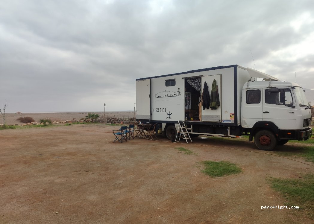 Si vous êtes automnes à 100%, l'étape peut-être agréable. Terrain contre la plage, mais celle-ci étant polluée par les déchets plastiques déversés par l'Oued, il vaut mieux se baigner à d'autres endroits. Eau saumâtre tirée au seau du puits, vidage cassette dans WC turc. Lieu très calme la nuit. Abdul est une personne très agréable qui saura vous rendre service. Très rustique mais authentique.