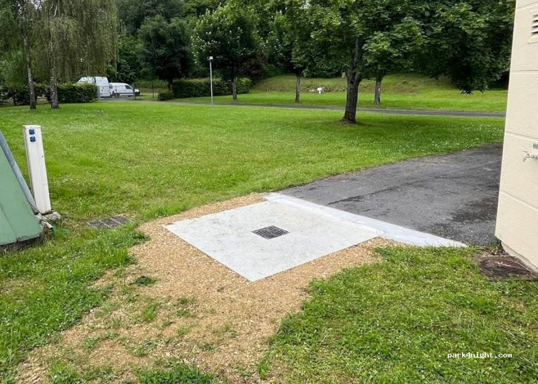 Petit emplacement pour 9 camping-cars et tentes du côté opposé. Quartier très calme dans une belle ville. A accès à l'électricité, aux douches, aux toilettes et aux déchets.