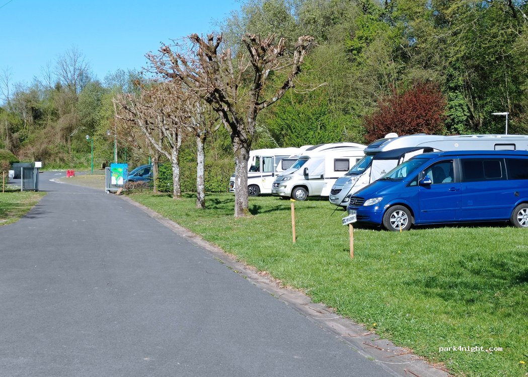 Small site for 9 motorhomes and tents on the opposite side. Very quiet area in a beautiful town. Has access to electric, showers, toilets and waste.