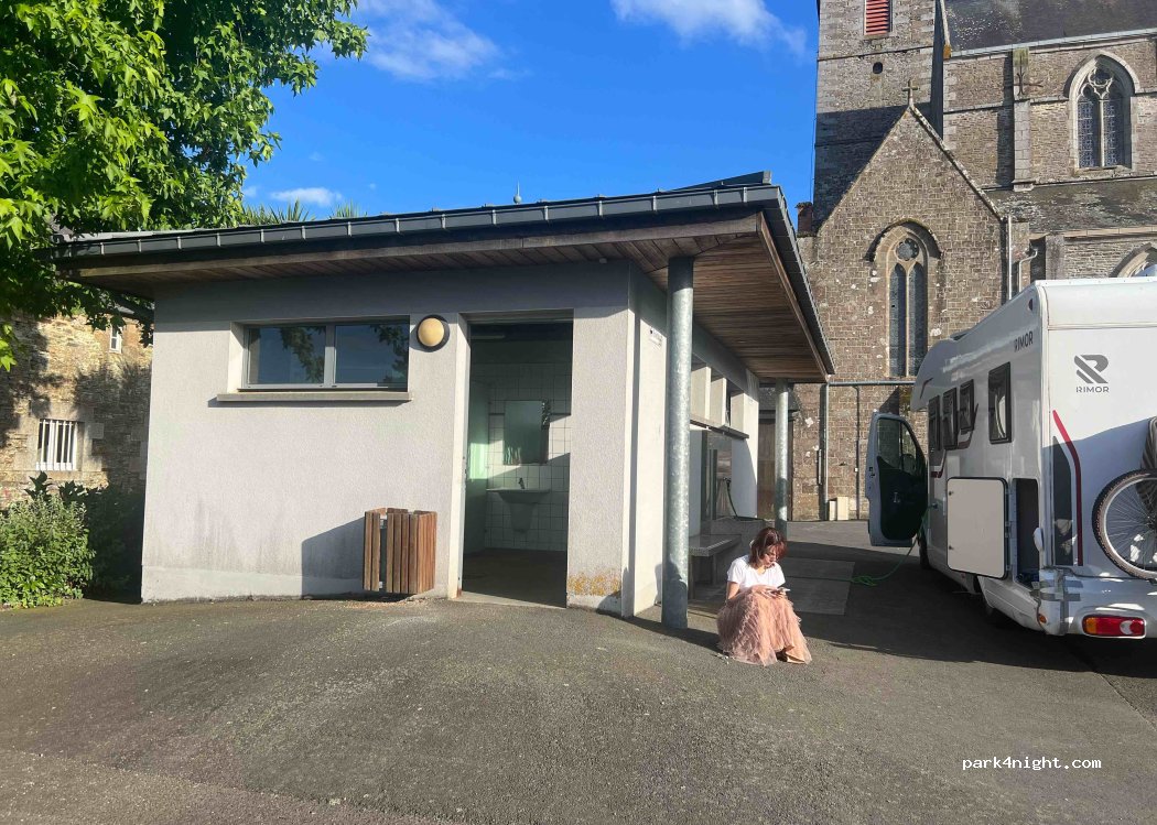 Parking ouvert à côté de l'église, pas de limite de hauteur ni de taille, remplissage d'eau facile grâce à un adaptateur. Belle ville!
