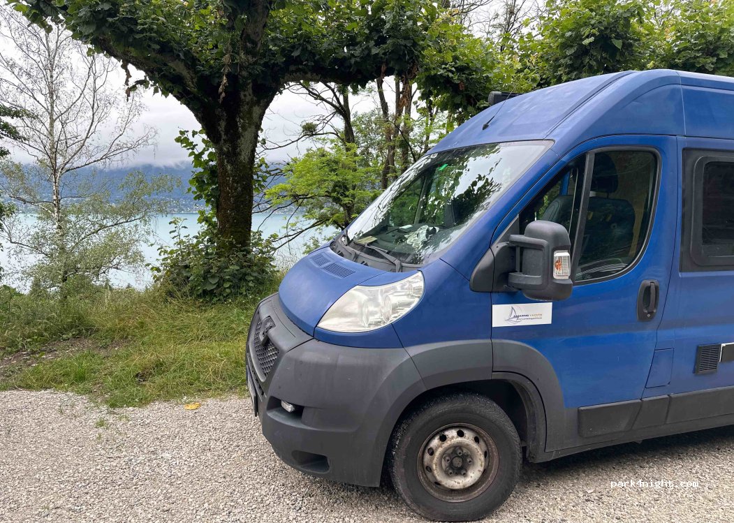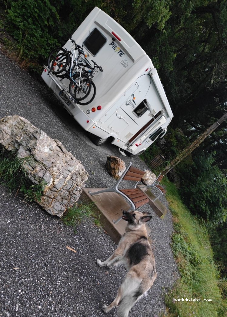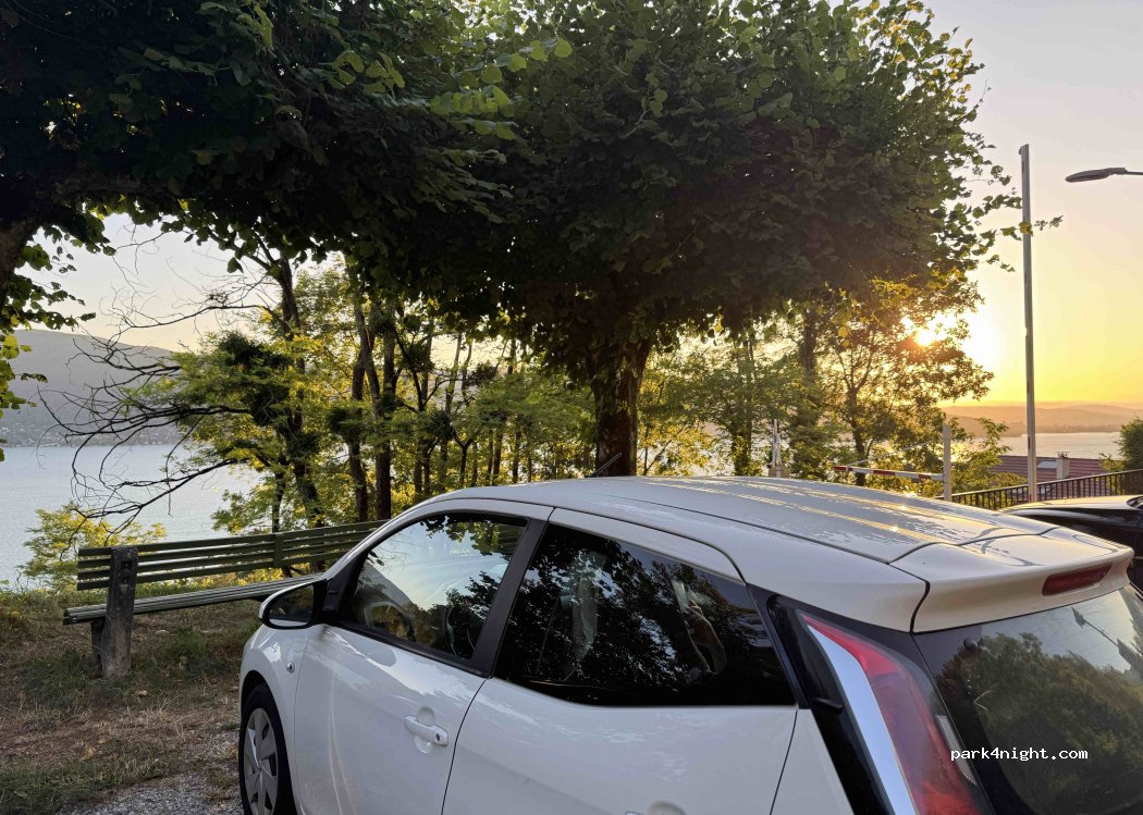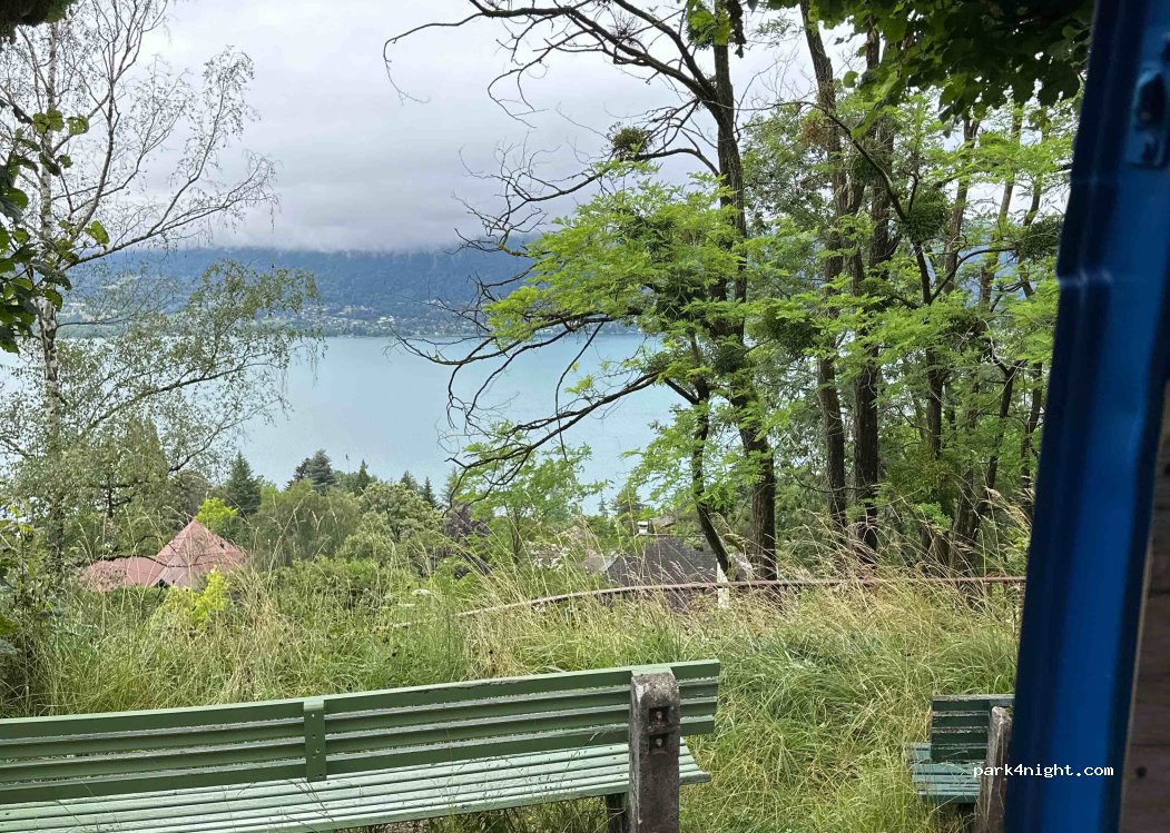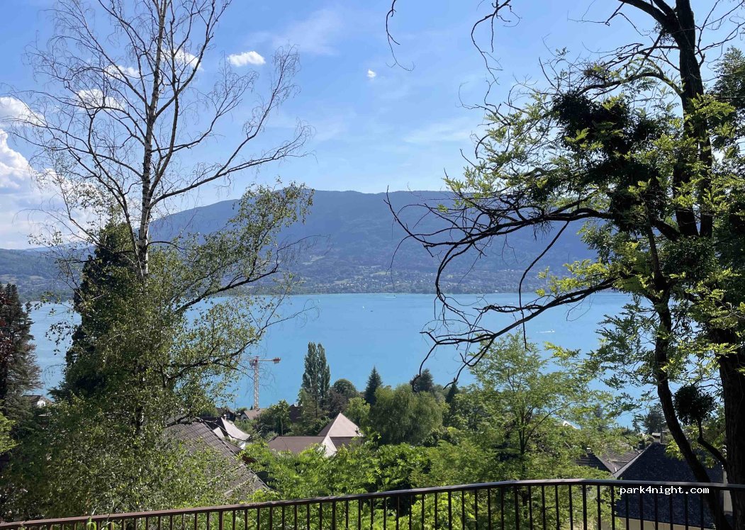 Petit parking avec bancs et vue magnifique sur le lac d Annecy. Route fort passante mais un peu moins de circulation après 20h.