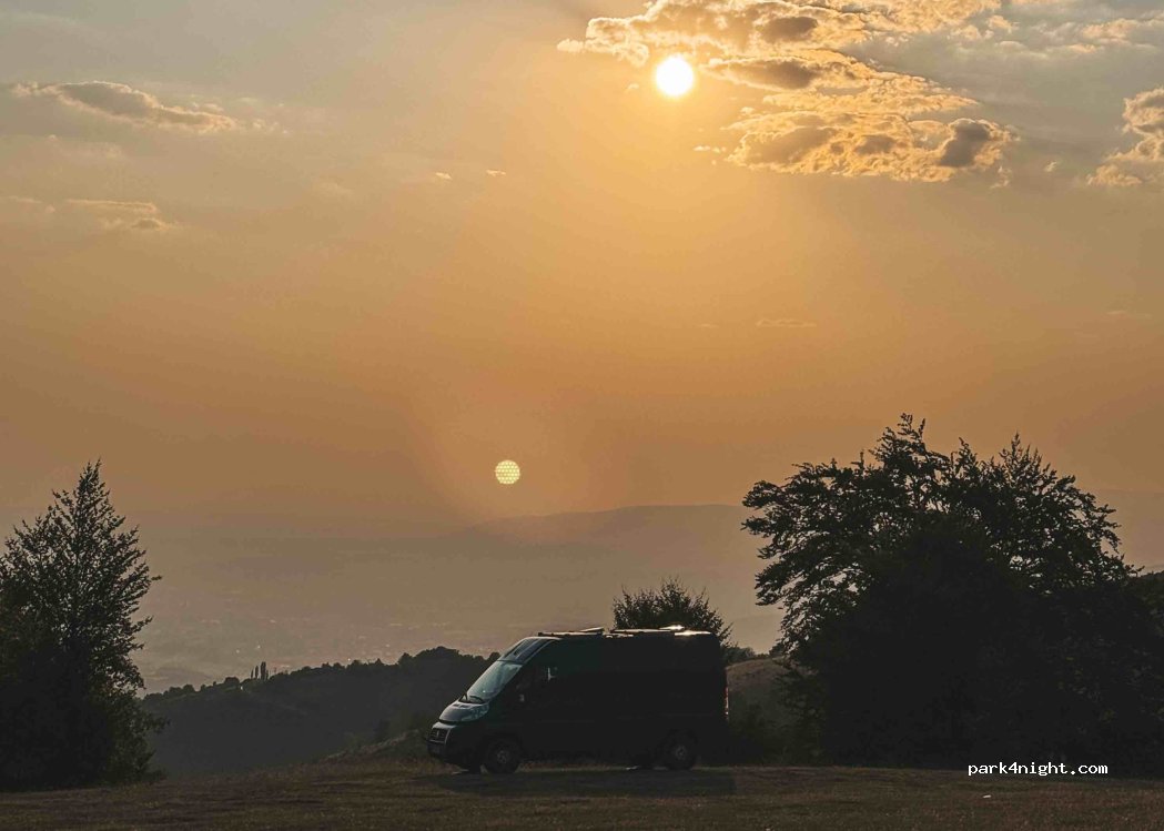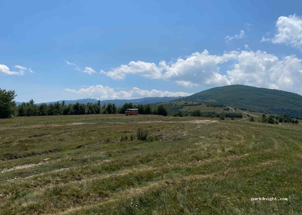 Open grassland on three mountain peaks with great panoramic views and many spots to choose from. Infinitely better than the nearby place with no views and on the side of the road. A bit short and steep road to get here so won't be good for all vehicles but if you like parking outside you should be fine. If you can't make it up here, there are also places in a meadow further down but closer to the road.