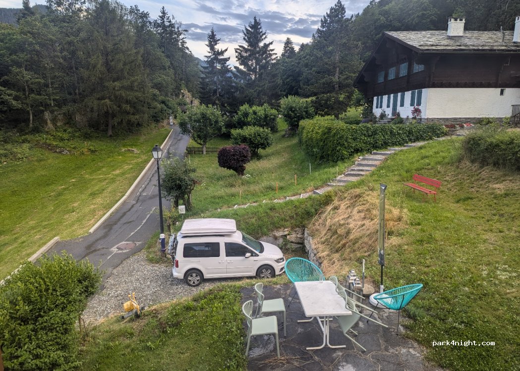 place de parking prêté par les propriétaires qui étaient absents. des wc publics à 300m, très propres (fermés la nuit) une vue magnifique, un calme incroyable, le son des cloches des vaches du dessus! bref parfait!