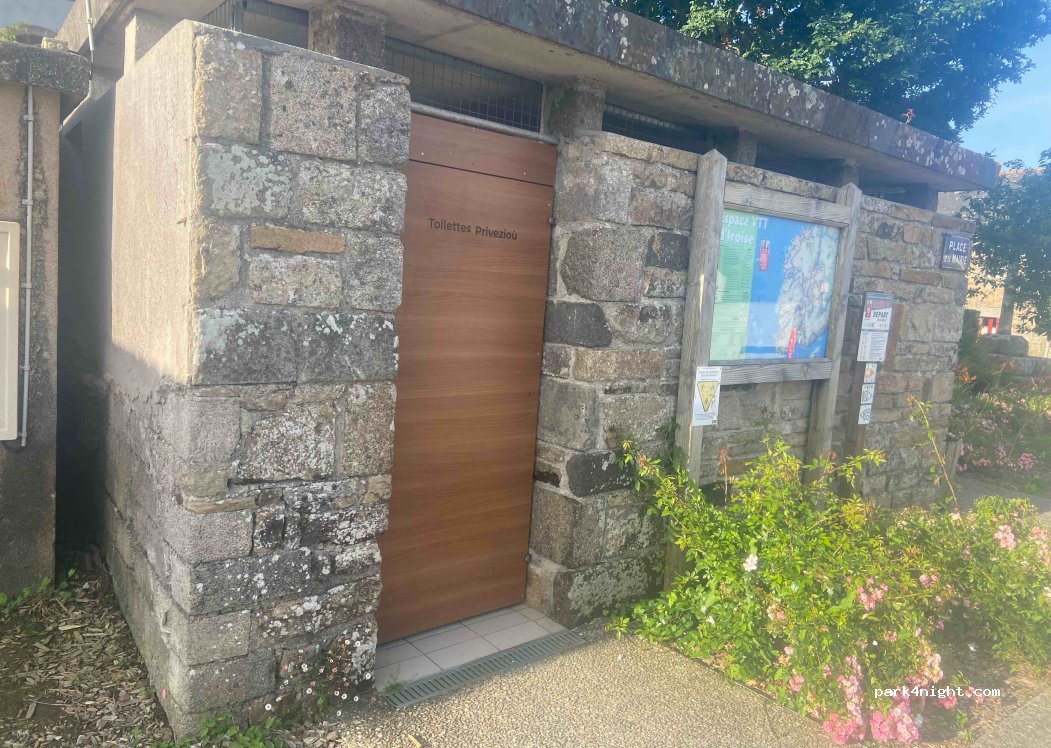 Toilettes publiques. Toilettes et urinoir. Eau qui coule. Pas de papier, pas de savon. Bon accès. Assez de places de parking.