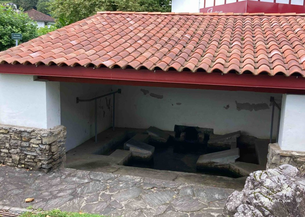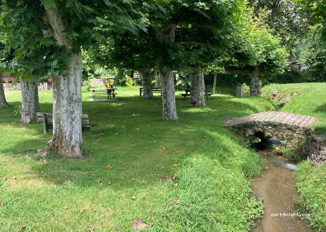 Platanen sorgen für Schatten. Spielplatz, Pelota-Platz und Kneippbecken nebenan. Hier fließen zwei Bäche zusammen. Kostenlose Parkplätze 30m entfernt. Keine öffentlichen Toiletten an diesem Ort.